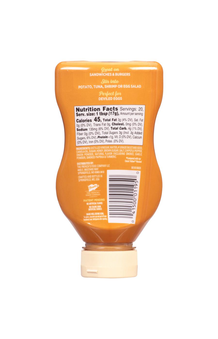Whether you're a fan of a BLT, hero or grilled chicken sandwich, a dab of French's Creamy Chipotle Mustard Spread elevates it with the flavor of sweet, smoky and tangy mustard. It's from French's, America's favorite mustard since 1904, and it's made with quality spices. Banish the plain and dry sandwich from your table. Bring out a mustard spread that's crafted with a delicious balance of honey, chipotle pepper and #1 grade mustard seed. Its thick and creamy texture makes it so spreadable on your sandwich, adding irresistible flavor along with moistness. Perfect at barbecue time- it goes great on burgers and hot dogs or spread on meats before grilling to seal in juices and create a flavorful crust. Add also to deviled eggs, potato salad and coleslaw.- French’s mustard with a sweet honey and smoky chipotle twist- Thick and creamy consistency for maximum spreadability- Flavor complements any sandwich; great on burgers and hot dogs- Creamier than regular mustard; ideal for deviled eggs and picnic salads- Comes in a convenient inverted squeeze bottle that’s easy-to-use and mess-free- Gluten-free and contains no artificial flavors or colors from artificial sources- Made with #1 grade mustard seed and quality spices