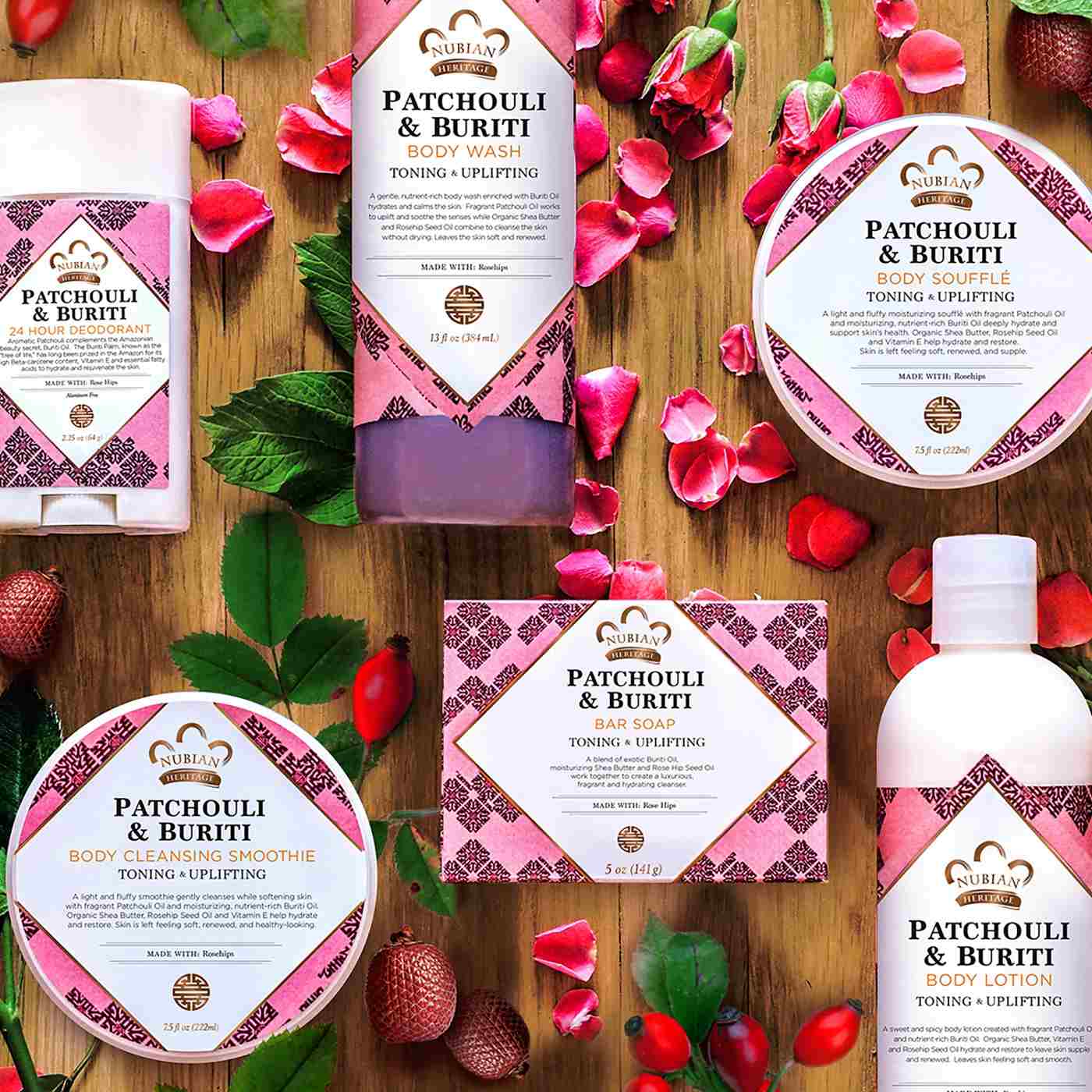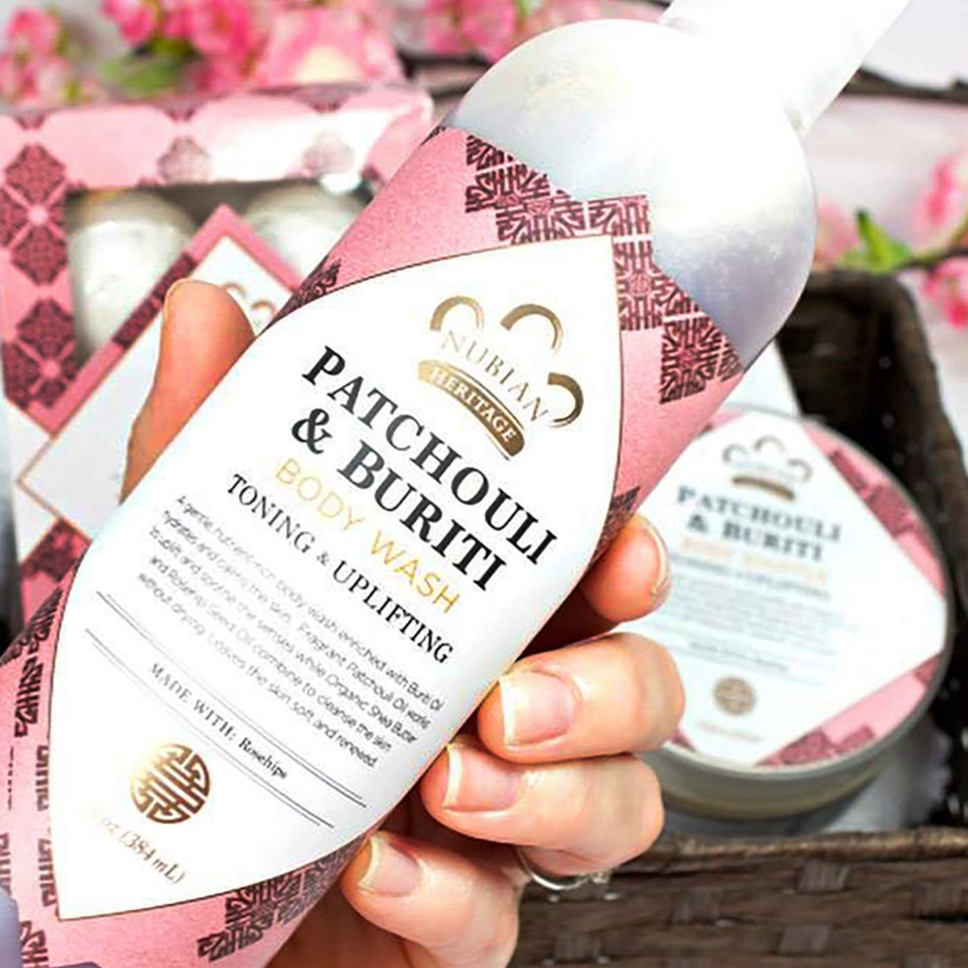 Product Features- GENTLY CLEANSES: Nubian Heritage Patchouli & Buriti Toning & Uplifting Body Wash is a gentle, silky body wash that cleanses skin to leave it with a beautiful glow.