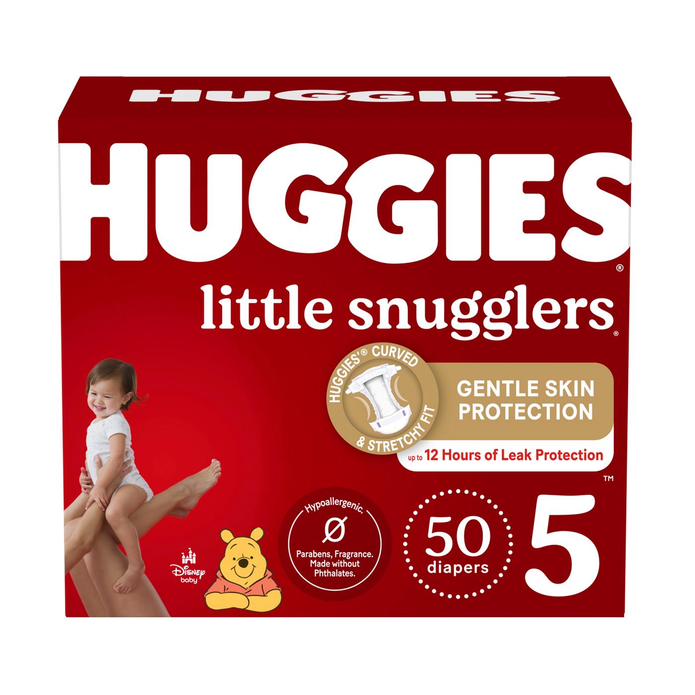 With up to 12 hours of leak protection for your baby’s skin, Huggies Little Snugglers Diapers are our perfect choice for your little one. Huggies Little Snugglers newborn diapers offer gentle skin protection and showcase a curved and stretchy fit. These baby diapers feature Huggies' GentleAbsorb Liner that absorbs wetness on contact to help keep your baby’s skin clean and healthy. Plus, with a soft, pocketed back waistband, these disposable baby diapers help prevent leaks and blowouts while helping keep mess away from your baby's skin. Huggies is the only leading brand entirely fragrance free*, our diapers are also made without parabens, lotions, elemental chlorine and natural rubber latex. Little Snugglers also feature a wetness indicator that lets you know when its time to change. Featuring Disney Winnie the Pooh designs, Little Snugglers Diapers are available in size Preemie (up to 6 lbs), size Newborn (up to 10 lbs), size 1 (8-14 lbs), size 2 (12-18 lbs), size 3 (16-28 lbs), size 4 (22-37 lbs), size 5 (27+ lbs) and size 6 (35+ lbs). (*among leading national diaper brands, across all offered variants)• Huggies Little Snugglers Diapers: 50 baby diapers, size 5 (27+ lbs)• Our diapers have Huggies Leak Lock System that offers up to 12 hours of leak protection• Baby diapers have a curved and stretchy fit with all-around comfort for a gentle tummy fit• The only brand with a blowout blocker across all our offerings* (*among branded open diapers. Excludes preemie size.)• The Only Brand Entirely Fragrance Free*: All Huggies diapers are safe for sensitive skin, hypoallergenic and free of fragrances (*among leading national diaper brands, across all offered variants)• A breathable outer cover helps keep baby's skin healthy• Features Disney designs as cute as your baby; packaging may vary