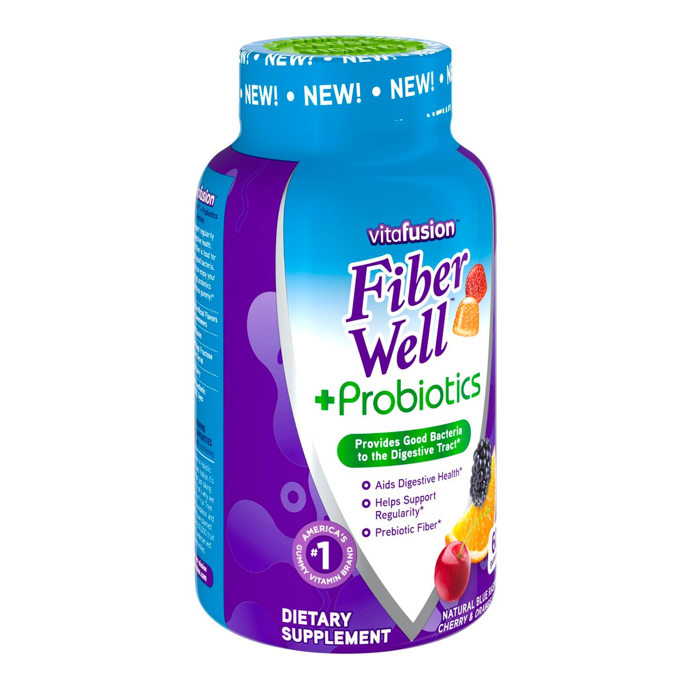 One serving of vitafusion Fiber Well offers 5 G of fiber, which aids in digestive health, helps maintain regularity and and provides a prebiotic effect in the gut. When it comes to getting your fiber, go with your gut and enjoy these great tasting gummies.
