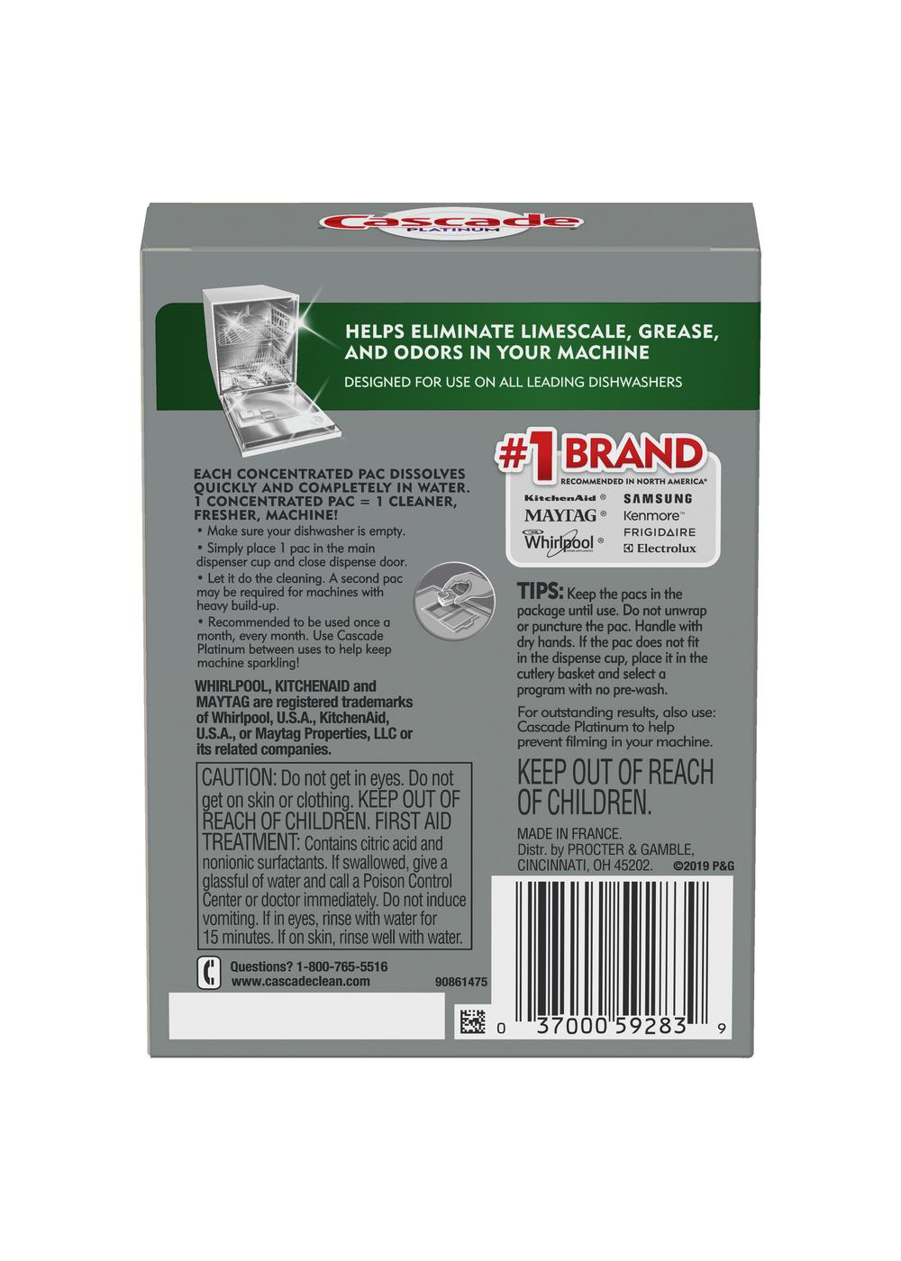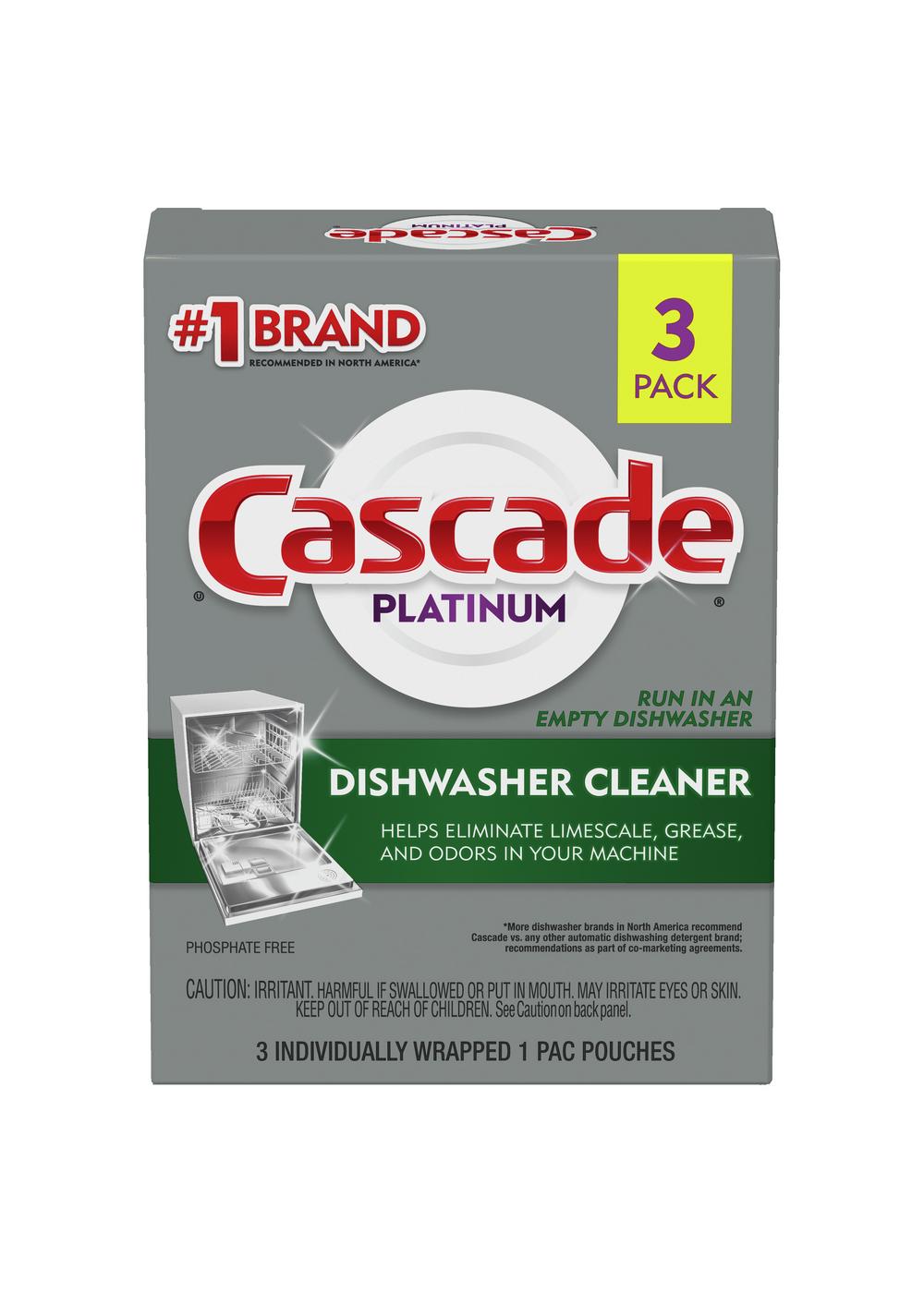 Remove limescale buildup, grease, and odors from your dishwasher with Cascade Dishwasher Cleaner. Cycle after cycle, your dishwasher machine can develop unsightly deposits, buildup, and odors. Cascade Dishwasher Cleaner helps eliminate odors and break through the buildup to reveal a fresher, cleaner dishwasher machine. Cascade Dishwasher Cleaner comes in easy-to-use, single-dose pacs. Simply toss one in and run a cycle to keep your dishwasher machine clean and as fresh as it should be. For best results, use Cascade Dishwasher Cleaner once a month to keep your dishwasher machine sparkling. Cascade Dishwasher Cleaner is recommended by Cascade Detergent. For our ultimate clean, use Cascade Dishwasher Cleaner with Cascade Power Dry Rinse Aid for powerful drying and Cascade Platinum dishwasher detergent. Cascade Dishwasher Cascade is the #1 Recommended Brand in North America* *More dishwasher brands in North America recommend Cascade vs. any other automatic dishwashing detergent brand, recommendations as part of co-marketing agreements