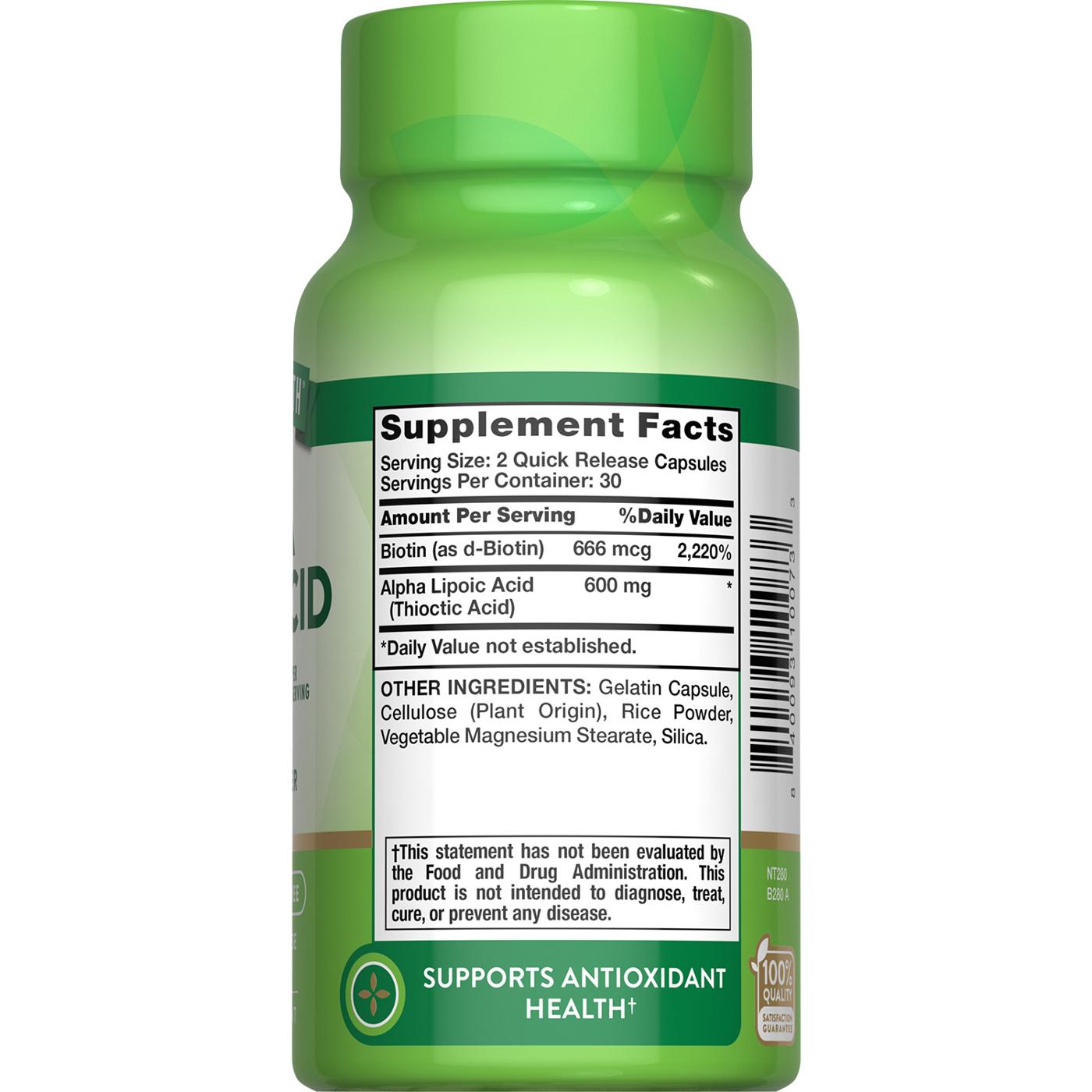 Alpha Lipoic Acid (ALA) is commonly referred to as the “universal antioxidant.” It is produced naturally by the body but also found in superfoods such as vegetables. It may be difficult to obtain optimal levels of this antioxidant from diet alone, you can turn to a high-quality trusted supplement for support. Each serving of our Alpha Lipoic Acid delivers 600 mg of Alpha Lipoic Acid and 666 mcg of Biotin in convenient quick release capsules. These capsules can aid in providing you with optimal antioxidant support, as well as the daily recommended value of Biotin. Our mission at Nature's Truth is to meet your wellness needs with products that go above and beyond. Nature's Truth provides supplements in various delivery forms, such as capsules, softgels, chewables, tablets, powders, liquids, and gummies to suit every preference.