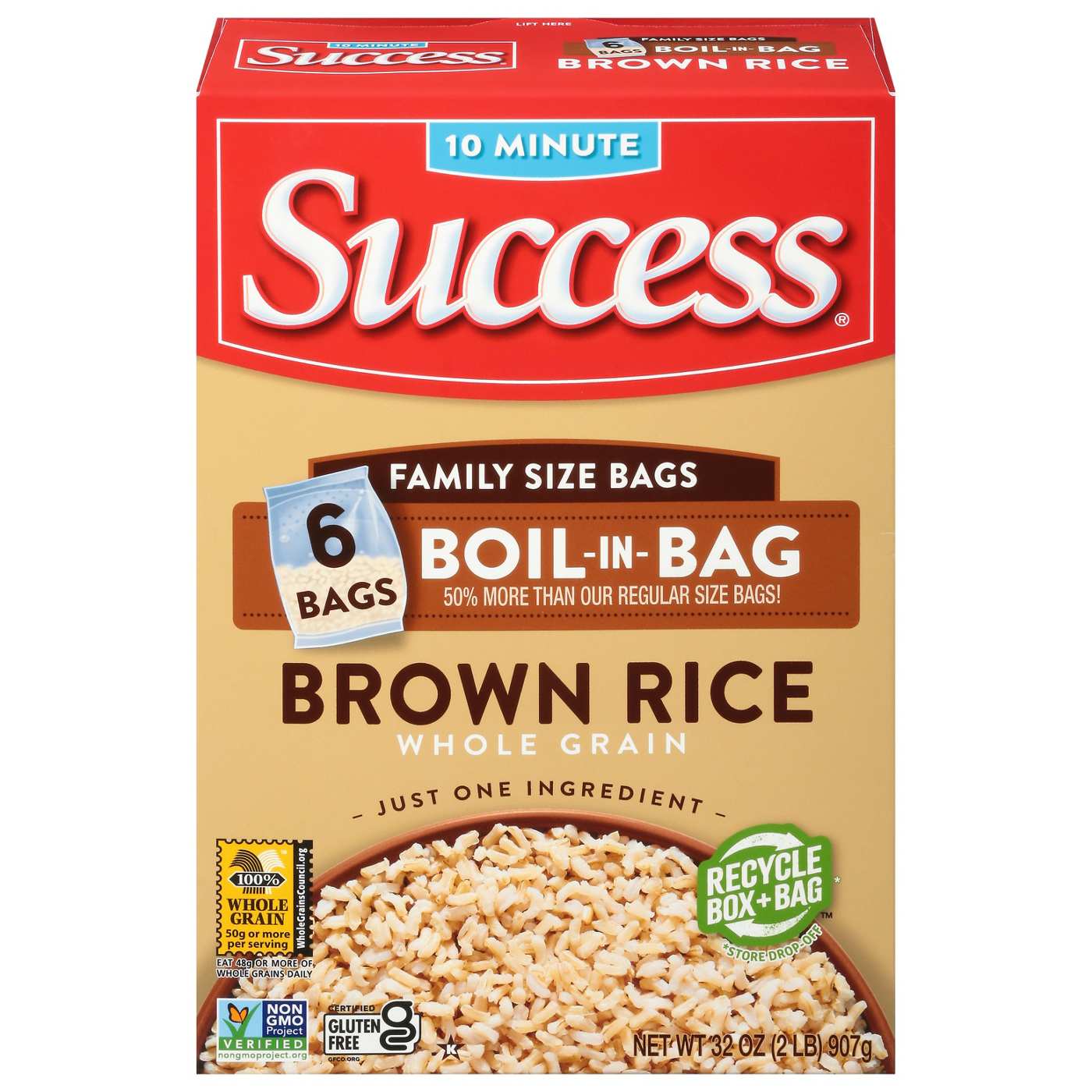 Our 100% whole grain Success Boil-in-Bag Brown Rice makes sure you have a serving of fluffy, nutty Brown Rice that cooks up perfectly every single time. And since our high-quality grains are pre-cooked, it’s ready in just 10 minutes – without the measure or the mess! Learn how to prepare our rice on the stove, in a rice cooker or in an Instant Pot. It’s pretty much like having a cheat code for mealtime. Success Brown Rice is an excellent source of complex carbohydrates, is 100% whole grain, sodium free, low fat, cholesterol free, and contains fiber. Our Boil-in-bag Brown Rice is free of MSG and preservatives and is Non-GMO Project Verified for you to be confident in your quick and delicious rice choice.• One 32 oz box (6 bags) of Success Boil-in-Bag Brown Rice• Make meals exceptional with just one ingredient, brown rice; it cooks up perfectly in 10 minutes• Create amazing dishes like rice salads, zesty stuffed bell peppers, or a creamy brown rice pudding• BPA-Free Boil-in-Bag offers easier prep with no measure or mess• No preservatives, Gluten-Free, no MSG, Non-GMO Project Verified, and Kosher Certified• Recycle both the box and the bag