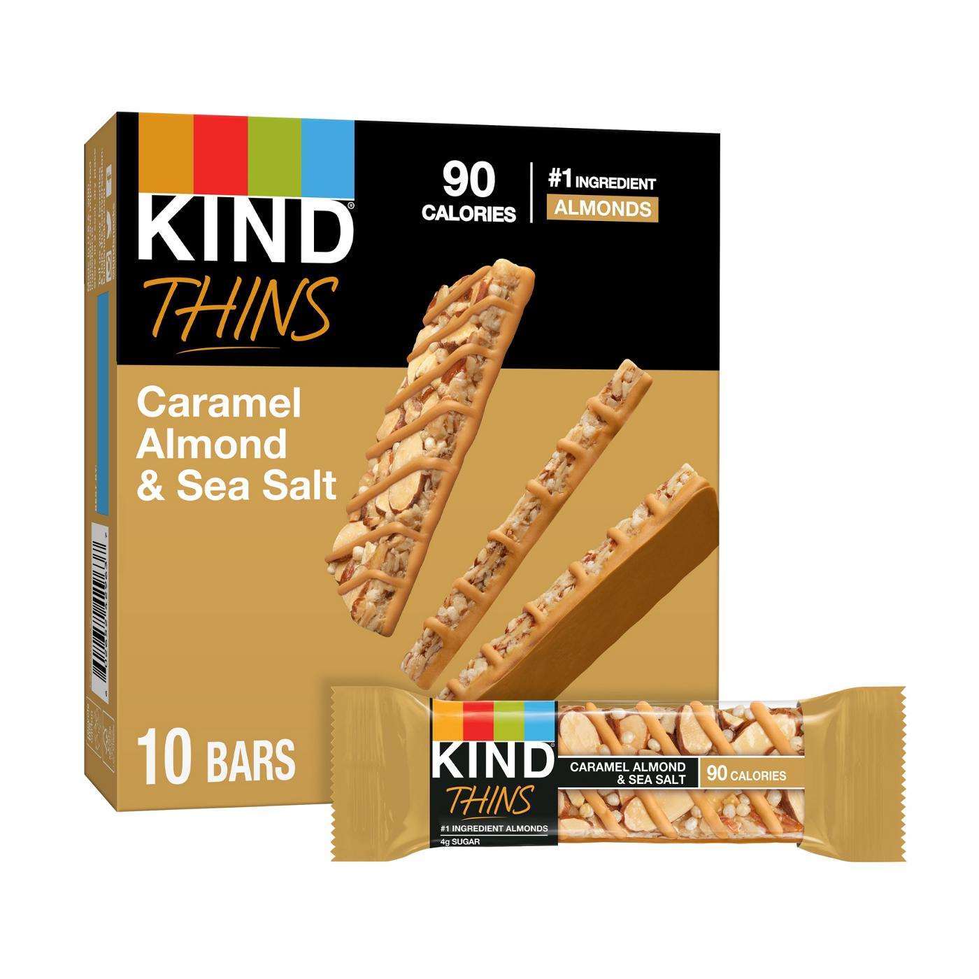 KIND THINS Caramel Almond & Sea Salt bars are a thinner take on your favorite KIND bar. With almonds as the #1 ingredient, these gluten free bars feature a thin layer of sliced almonds with a caramel coating and drizzle. These snack bars contain 4 grams of sugar and 90 calories per serving.