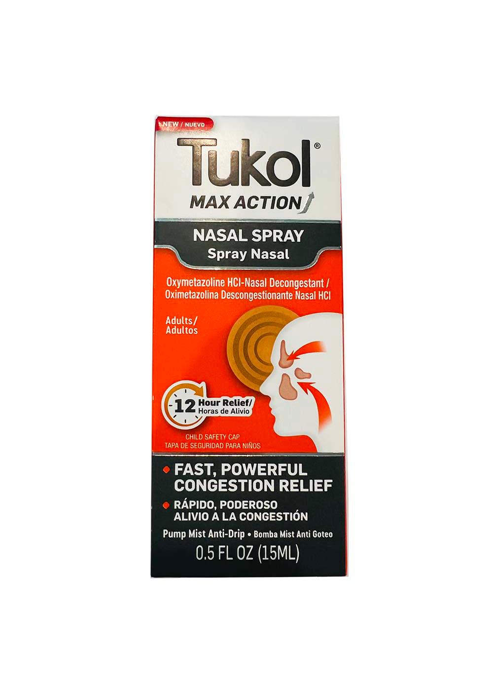 Find powerful relief from nasal congestion and sinus pressure with Tukol Max Action Nasal Spray. This fast-acting nasal decongestant is formulated for adults and contains Oxymetazoline Hydrochloride to deliver up to 12 hours of relief from allergy and cold symptoms. The convenient spray makes it easy to breathe clearer throughout the day.• Provides up to 12 hours of nasal congestion relief.• Fast-acting formula for sinus and allergy symptoms.• Active Ingredient: Oxymetazoline Hydrochloride.• Easy-to-use spray designed for adults.