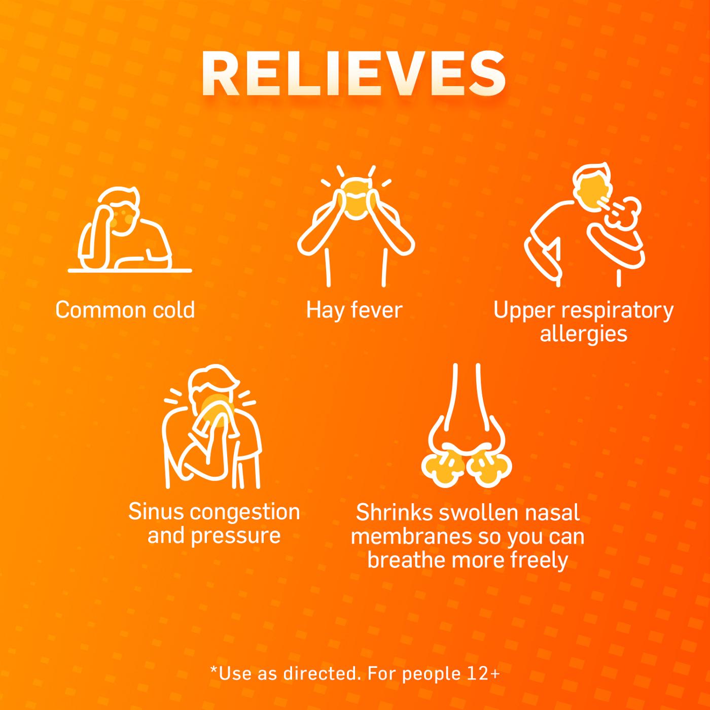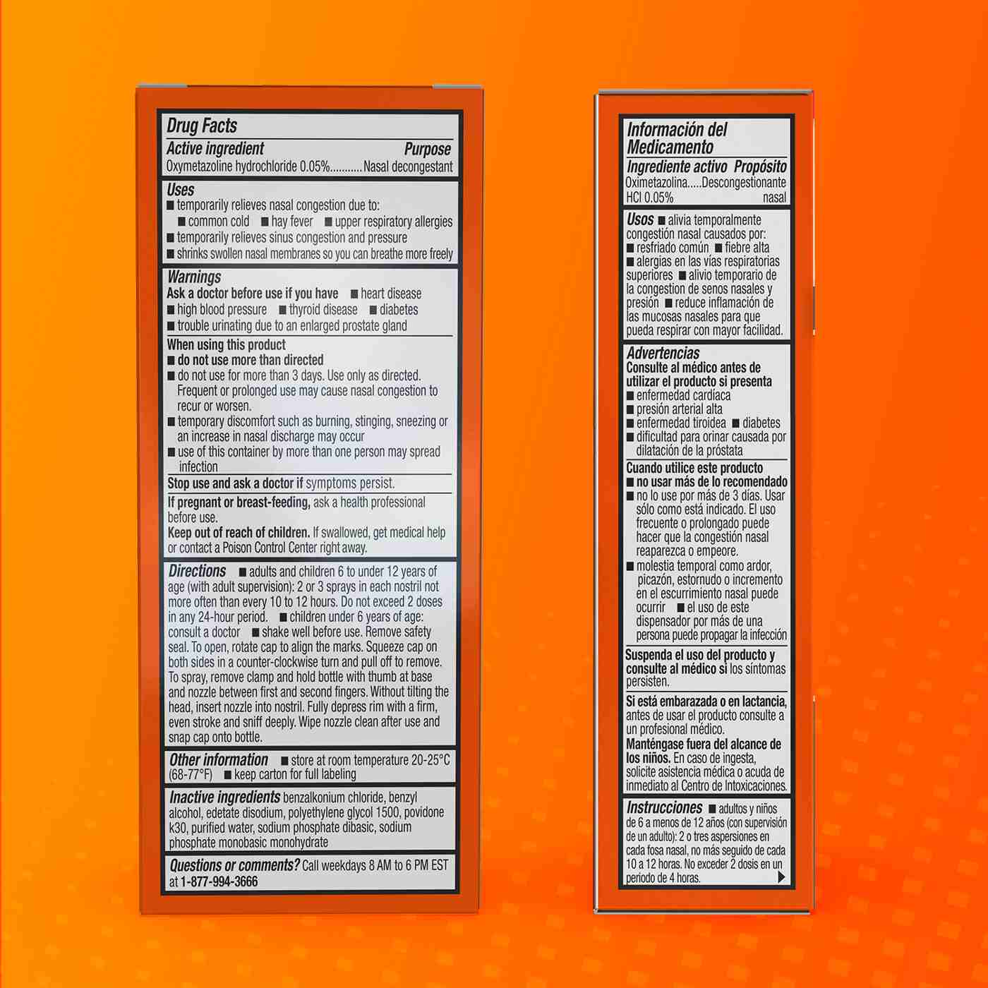 Active Ingredients: Oxymetazoline Hydrochloride (0.05 %), Nasal Decongestant. Inactive Ingredients: Benzalkonium Chloride, Benzyl Alcohol, Edetate Disodium, Polyethylene Glycol 1500, Povidone K30, Purified Water, Sodium Phosphate Dibasic, Sodium Phosphate Monobasic Monohydrate.Allergens and safety warnings