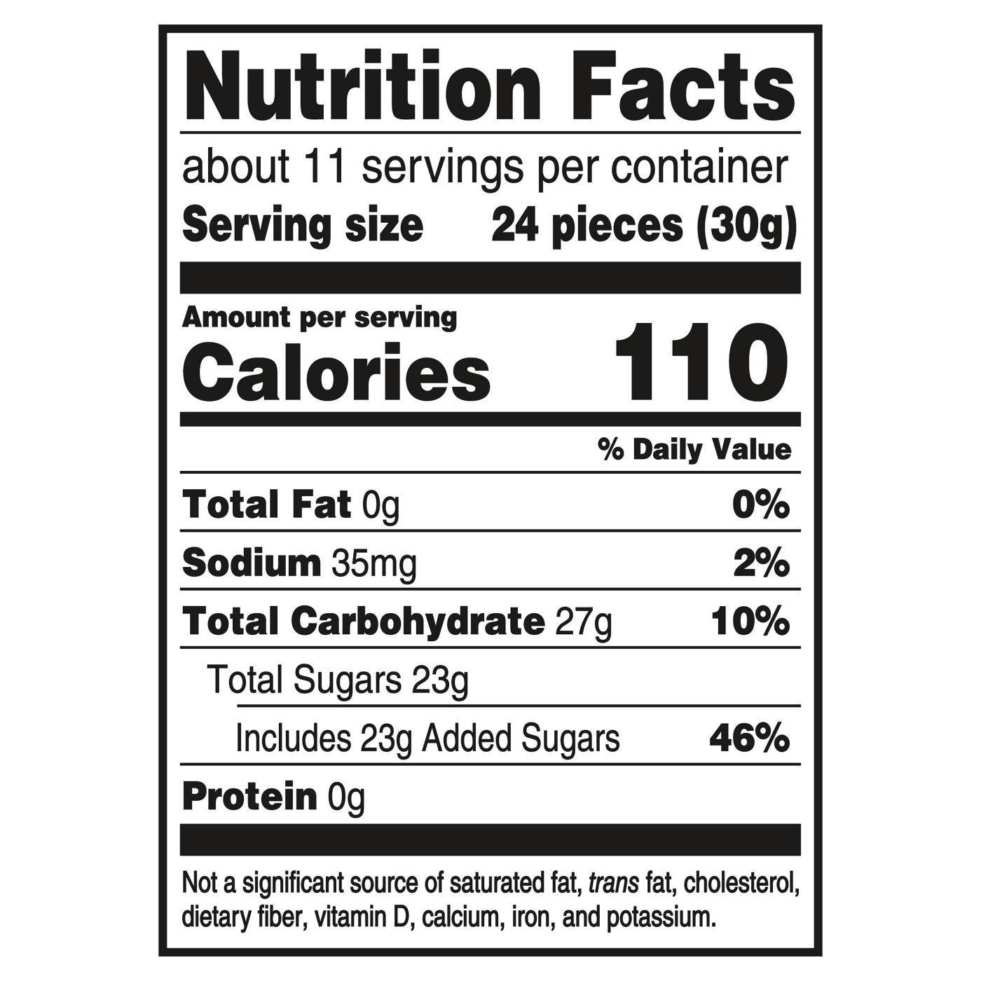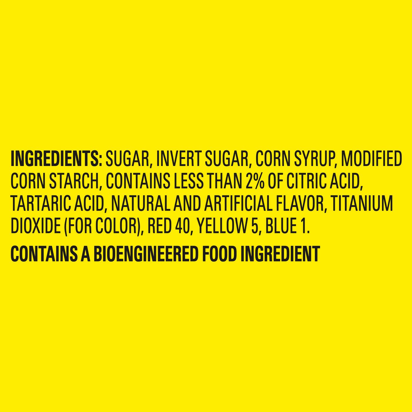 Sugar, Invert Sugar, Corn Syrup, Modified Corn Starch, Contains Less Than 2% Of Citric Acid, Tartaric Acid, Natural And Artificial Flavor,Titanium Dioxide (For Color), Red 40, Yellow 5, Blue 1.Allergens and safety warnings