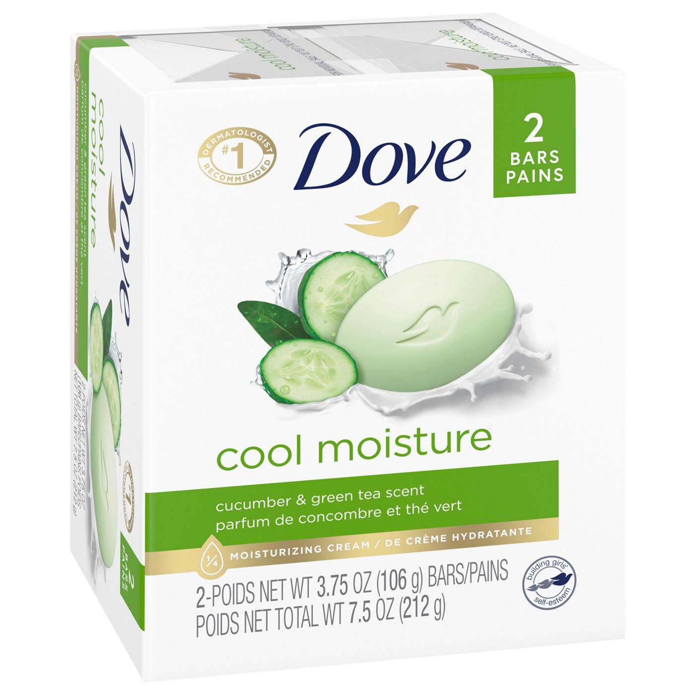 Refresh your skin with the Dove Cool Moisture soap bar, featuring the crisp and uplifting scent of cucumber and green tea. This bar provides a moisturizing clean that helps wash away the day, leaving skin feeling fresh. The gentle formula is suitable for both face and body.• Formulated with ¼ moisturizing cream to prevent dryness.• Creates an airy lather that rinses away with no residue.• Leaves skin feeling cool, hydrated, and revitalized.• Helps maintain skin's moisture barrier during cleansing.