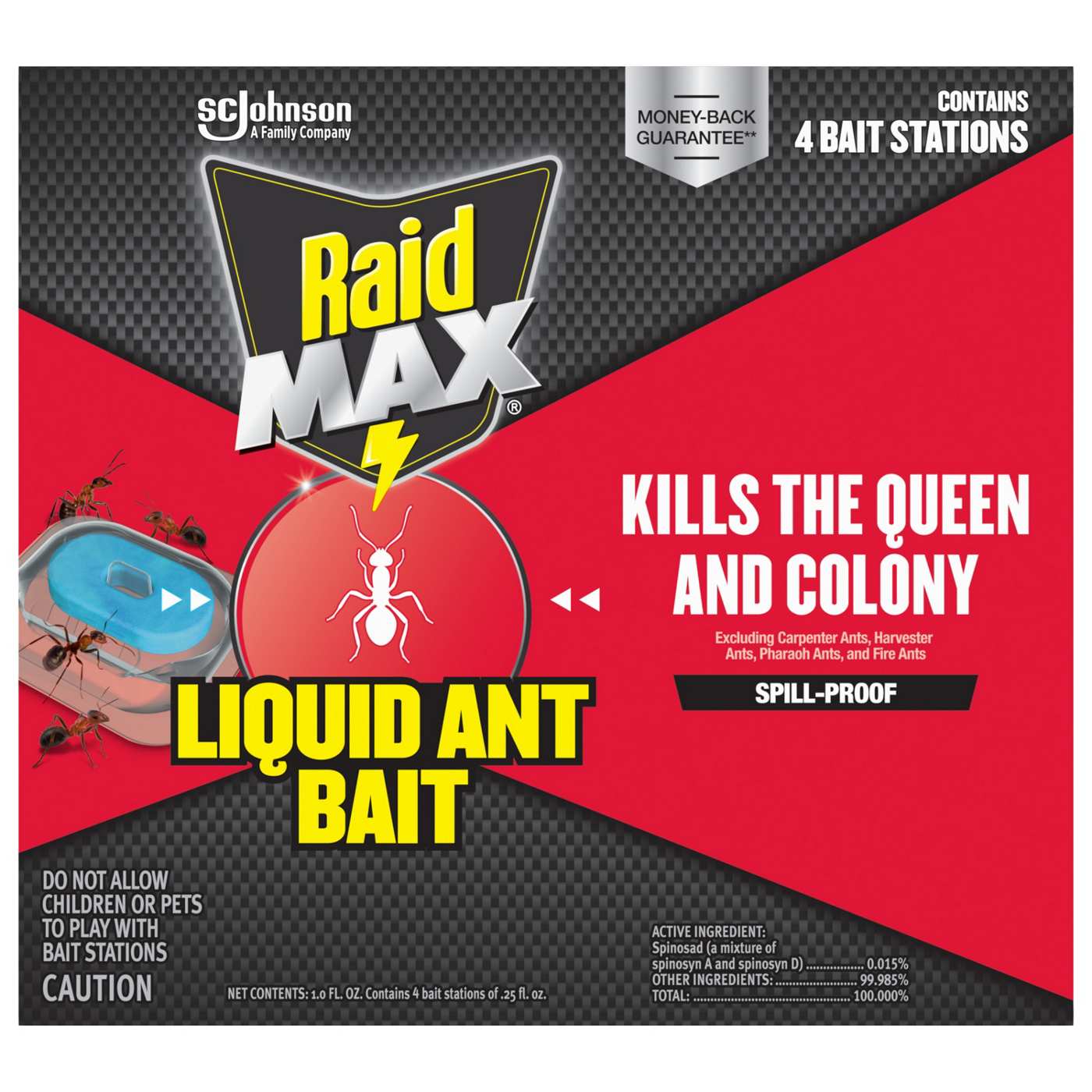 Raid® MAX Liquid Ant Bait kills listed ants where they breed.* The pre-filled liquid ant killer is both convenient and ready-to-use. *See the label for details
