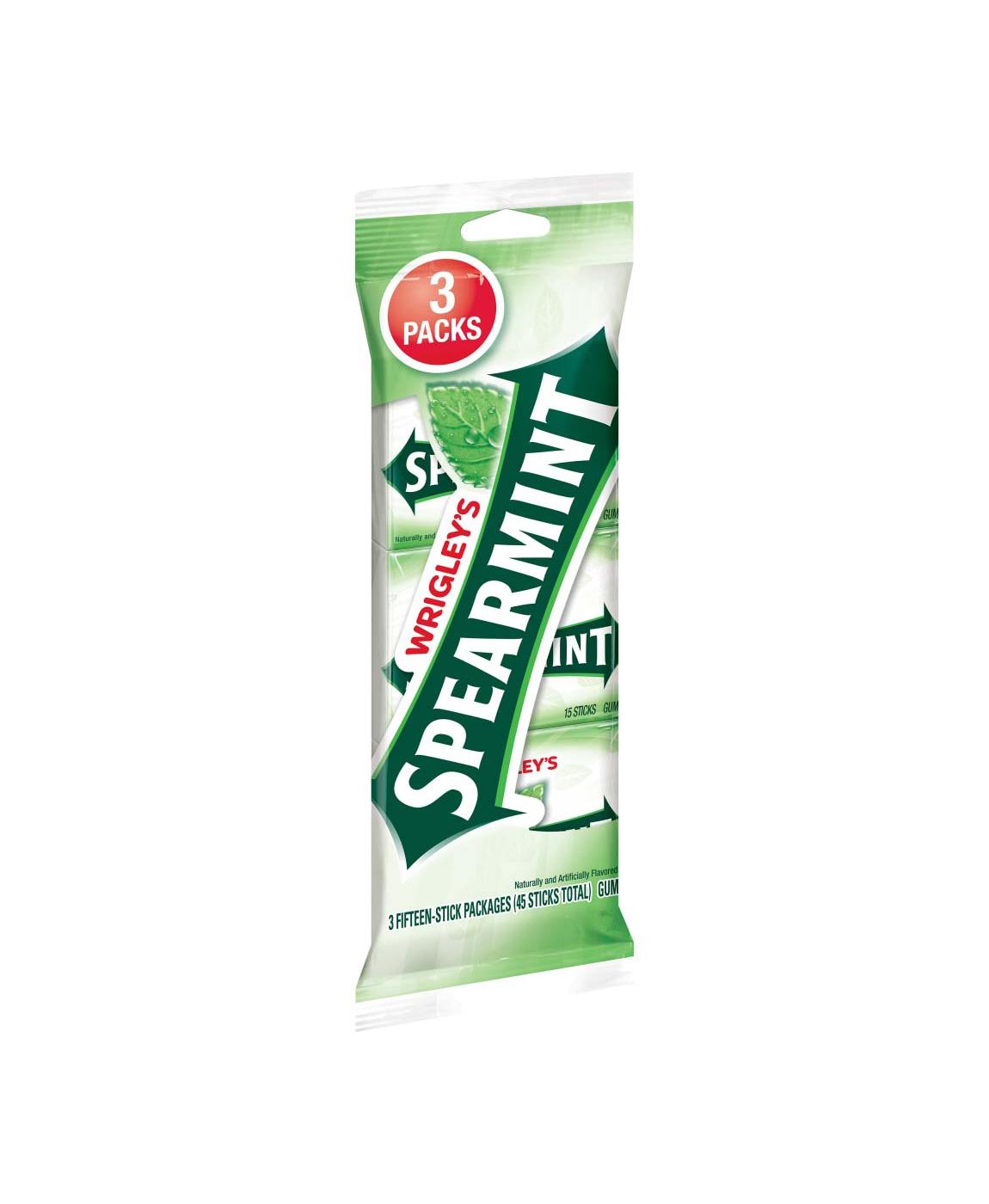 Since 1893, WRIGLEY'S Spearmint chewing gum has been freshening breath and making each day a little brighter. Why has Spearmint gum stayed so popular for so long? Because fresh doesn't go out of style. Spearmint chewing gum has been fresh since "fresh" was hip and "hip" was cool. So cool off your taste buds with the gum that's been keeping it fresh for over a hundred years.-Package includes 15 individually wrapped sticks of Wrigley's Spearmint chewing gum, 3 packs total-Wrigley's Spearmint chewing gum has been a favorite since it launched in 1893-Each single pack contains easy-to-share, individually wrapped sticks of gum-The great spearmint taste of Spearmint chewing gum has been providing refreshment for over 100 years-When you want that classic spearmint flavor that you've always enjoyed, there's only one Wrigley's Spearmint