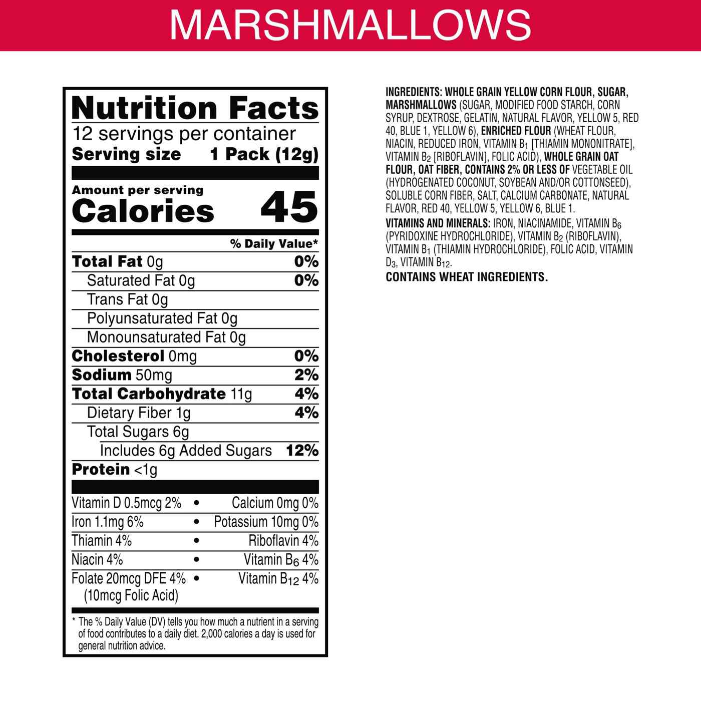 WHOLE GRAIN YELLOW CORN FLOUR, SUGAR, MARSHMALLOWS (SUGAR, MODIFIED FOOD STARCH, CORN SYRUP, DEXTROSE, GELATIN, NATURAL FLAVOR, YELLOW 5, RED 40, BLUE 1, YELLOW 6), ENRICHED FLOUR (WHEAT FLOUR, NIACIN, REDUCED IRON, VITAMIN B1 [THIAMIN MONONITRATE], VITAMIN B2 (RIBOFLAVIN], FOLIC ACID), WHOLE GRAIN OAT FLOUR, OAT FIBER, CONTAINS 2% OR LESS OF VEGETABLE OIL (HYDROGENATED COCONUT, SOYBEAN AND/OR COTTONSEED), SOLUBLE CORN FIBER, SALT, CALCIUM CARBONATE, NATURAL FLAVOR, RED 40, YELLOW 5, YELLOW 6, BLUE 1, VITAMINS AND MINERALS: IRON, NIACINAMIDE, VITAMIN B6 (PYRIDOXINE HYDROCHLORIDE), VITAMIN B2 (RIBOFLAVIN), VITAMIN B1 (THIAMIN HYDROCHLORIDE), FOLIC ACID, VITAMIN D3, VITAMIN B12.Allergens and safety warnings