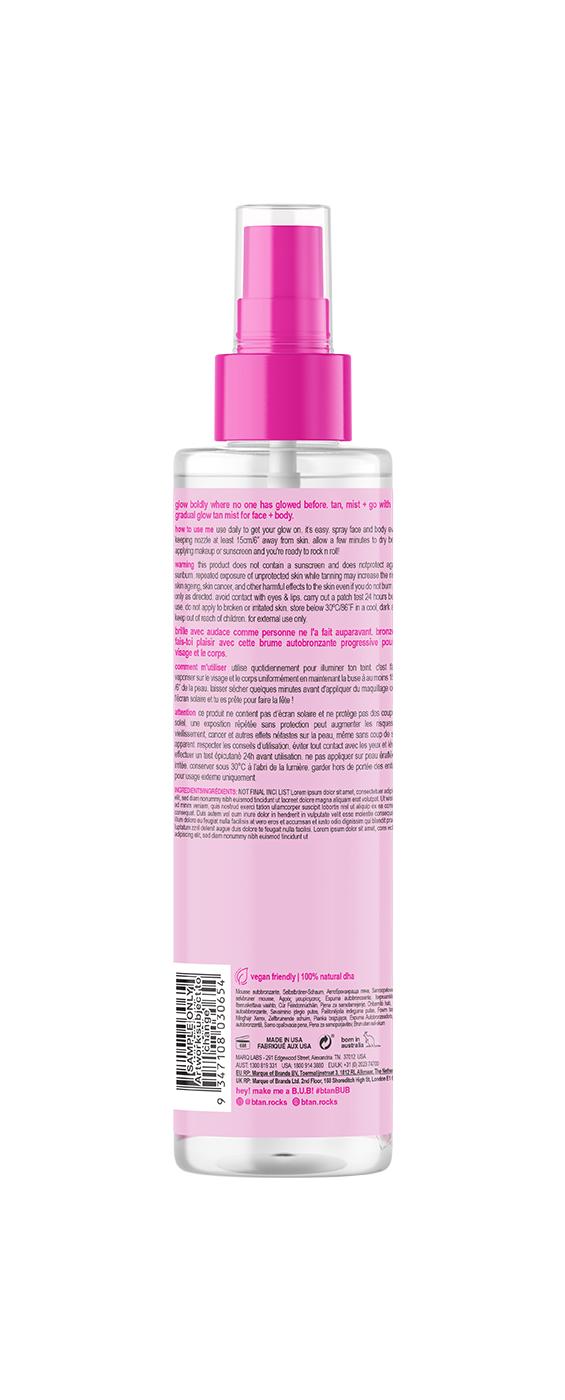 when you're looking for a tan that keeps you glowing all day long, just tan, mist & go with this luminous face & body gradual tan mist. top up your tan or create one from scratch - you can glow your own way. brings out your inner sparkle so you can shine on inside and out. after all glowing skin is always in.