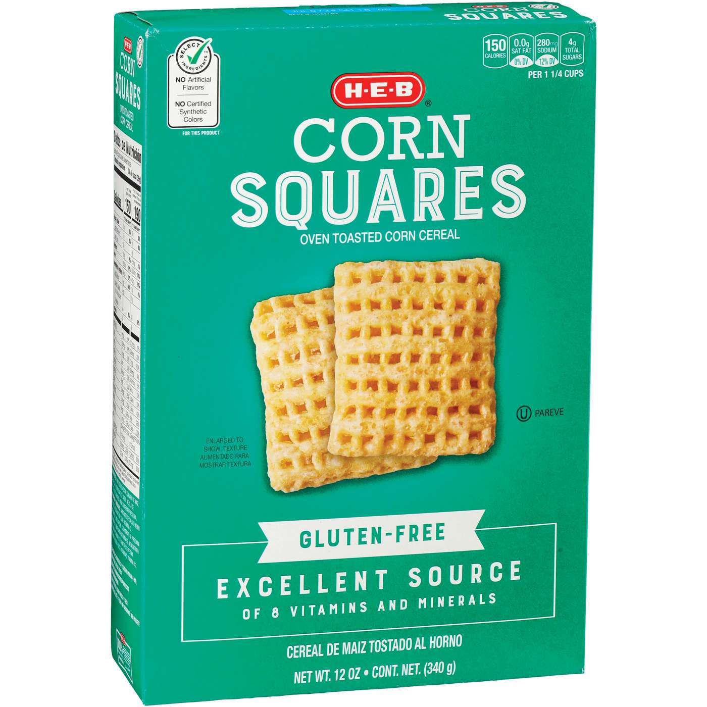 Offering an excellent source of 8 vitamins and minerals, H-E-B Corn Squares cereal is great for breakfast time and more. Oven-toasted for that crisp crunch, these puffy, gridded squares are a key ingredient for making your favorite party snack mix (see recipe below). Gluten-free.
