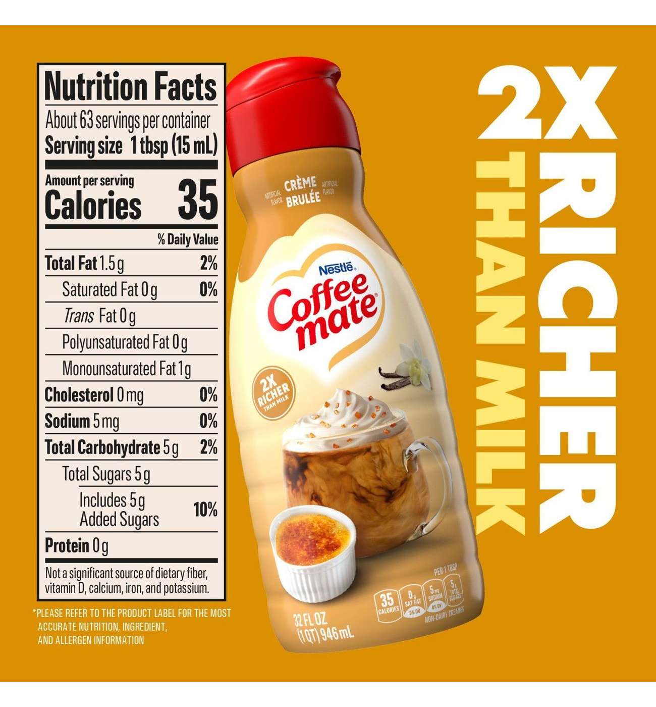 • FOR THE LOVE OF COFFEE: Ditch your boring coffee routine and upgrade your brew game with our Coffee mate Crème Brulee Flavored Coffee Creamer. We’ve been working on our recipes since 1961, so we know what we’re doing when it comes to our flavored coffee creamers• ICONICALLY NON-DAIRY AND GLUTEN-FREE: We’re all about creating tasty creamers that everyone can enjoy. Cheers to inclusive indulgence with our gluten-free, cholesterol-free, and non-dairy flavored creamer for coffee• HOT, ICED, OR MIXED: Our liquid creamer is your coffee’s new BFF — We’re here for your coffee mug, your cup and your martini glass, any time you’re looking to sweeten up your cup• MVP OF CREAMERS: Whoever said they didn’t like coffee creamer clearly hasn’t tried Coffee mate. Make your coffee goals a reality with our Crème Brulee flavored creamer• KEEP IT CHILL: Keep your Coffee mate creamer chilled for that perfect Crème Brulee flavor. Pop it in the fridge after opening and use your creamer within 14 days, if it even lasts that long• EVERY SIP COUNTS: Cheers to a brighter tomorrow with every mug! Our Crème Brulee flavored creamer comes in recyclable packaging