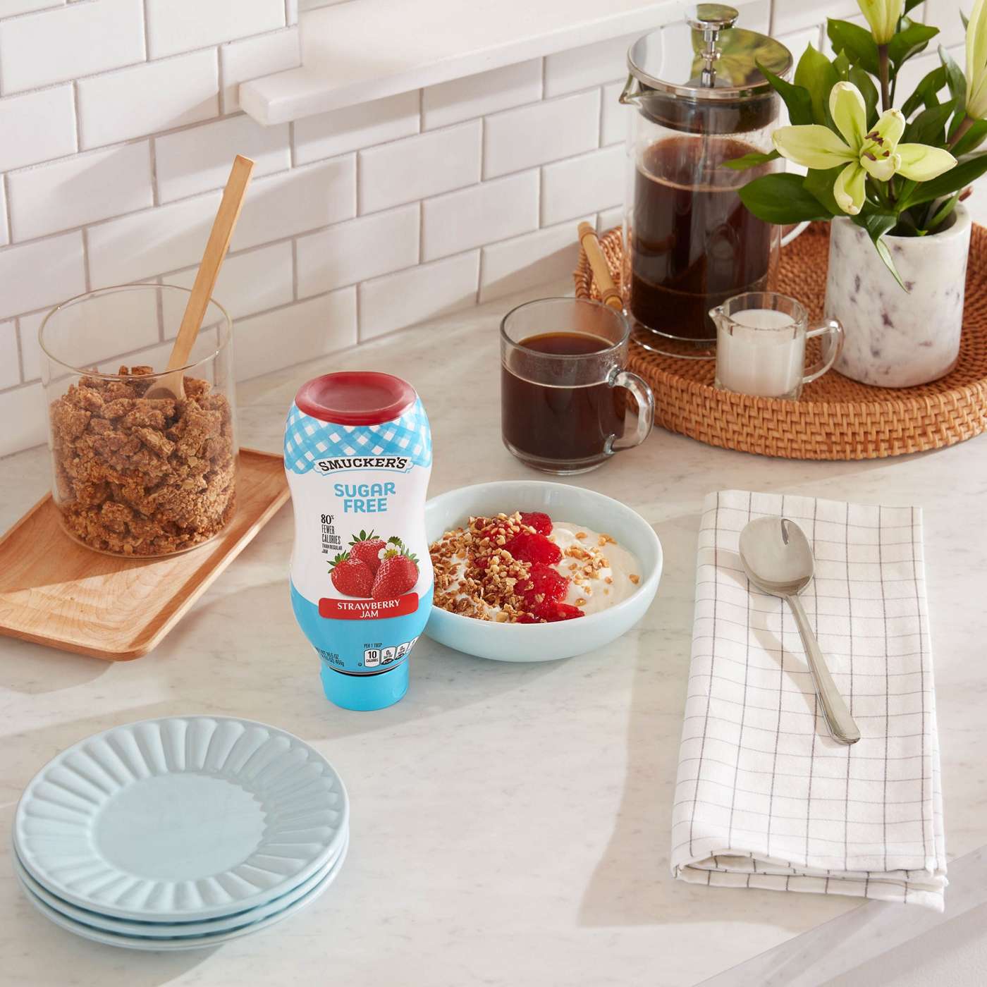 Embrace the sweet life — without all the sugar. Smucker’s Squeeze Sugar Free Strawberry Jam, letting you enjoy perfectly sweet strawberry taste without all the added sugar. So, whether you’re spreading it on a classic PB&J sandwich or blending it into your famous strawberry vinaigrette dressing, you’ll still find all the flavor you’re craving. And the convenient, squeezable bottle makes it a breeze to add a dollop of deliciousness to any snack or recipe — no utensils required. It’s a simple, mess-free way to squeeze in a little extra fun and flavor for the whole family.Contains one (1) 16.5 -ounce bottle of Smucker’s Squeeze Sugar Free Strawberry JamPerfectly sweet sugar free strawberry jam (80% fewer calories than regular jam. Calorie content has been lowered from 50 calories to 10 calories per serving)Easy-to-use, squeezable bottleClassic strawberry flavor without all the added sugarPerfect for on-the-go lunches or snacks