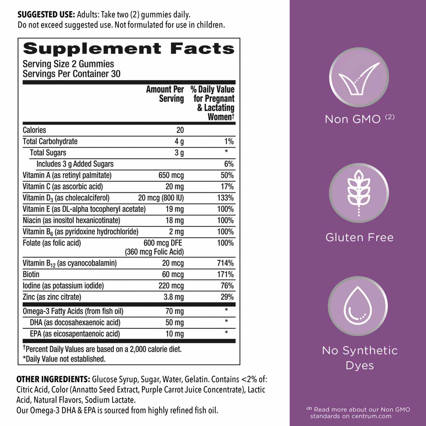 Centrum Prenatal Multivitamin Gummies deliver essential nutrients you and your little one need throughout your pregnancy in tasty mixed berry and orange flavors. These gummy multivitamins are crafted with folic acid and 10 other key vitamins to support pregnancy for women who are pregnant or trying to conceive (1). Centrum Prenatal gummies contain DHA and iodine to help support a healthy pregnancy, as well as vitamin D to help support bone health for both mother and baby (1). These vitamin gummies are formulated with folic acid to help support fetal brain and spinal cord development (1). These multivitamin gummies contain no iron which is known to cause stomach upset. Centrum Prenatal multivitamin gummies are intended to be taken with a well-balanced diet to support prenatal nutrition needs. Each serving of two Centrum gummies delivers the high-quality nutrients you and your baby need with no high fructose corn syrup, synthetic dyes, or artificial flavors or sweeteners. Chew two dietary supplement gummies daily with or without food to support you and your little one. For specialized supplements before, during and after pregnancy, choose Centrum daily supplements, the makers of the number 1 doctor recommended multivitamin brand. (1) These statements have not been evaluated by the Food and Drug Administration. This product is not intended to diagnose, treat, cure or prevent any disease. (2) Does not include iron• 60-count bottle of delicious mixed berry and orange flavored Centrum Prenatal Multivitamin Gummies• Gummies with ingredients specially crafted to support pregnancy and fetal development (1)• Centrum gummies with DHA, folic acid, vitamin D and other essential nutrients• Delicious fruit-flavored gummy prenatal multivitamin made with no high fructose corn syrup, synthetic dyes, or artificial flavors or sweeteners• Gluten-free prenatal gummy vitamins• Multivitamin gummies formulated with your self care in mind from Centrum, the makers of the number 1 doctor recommended multivitamin brand