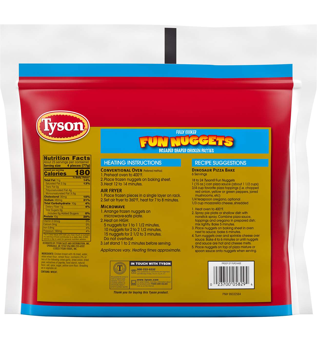 Add some prehistoric fun to meals with a family pack of Tyson Dino Nuggets. Fully cooked and breaded chicken patties take the shape of epic dinos in a fun-filled classic. Made with 100% all-natural* chicken, these dino nuggets are easy to make, dip, and enjoy. Made with white meat chicken and no added hormones or steroids**, these nuggets should be kept frozen until ready to prepare. Heat in an air fryer, oven, or microwave according to the directions on the bag to get warm and crispy dino nuggets with 13g of protein per serving. The family pack provides 20 servings of Tyson dino fun. Whether dunking dinos at school as part of an easy-to-pack lunch, snacking with some dino bites, or ending the day with a roaring good dinner, these dino nuggets are ready for the adventure. *Minimally processed, no artificial ingredients **Federal regulations prohibit the use of added hormones or steroids in chicken.