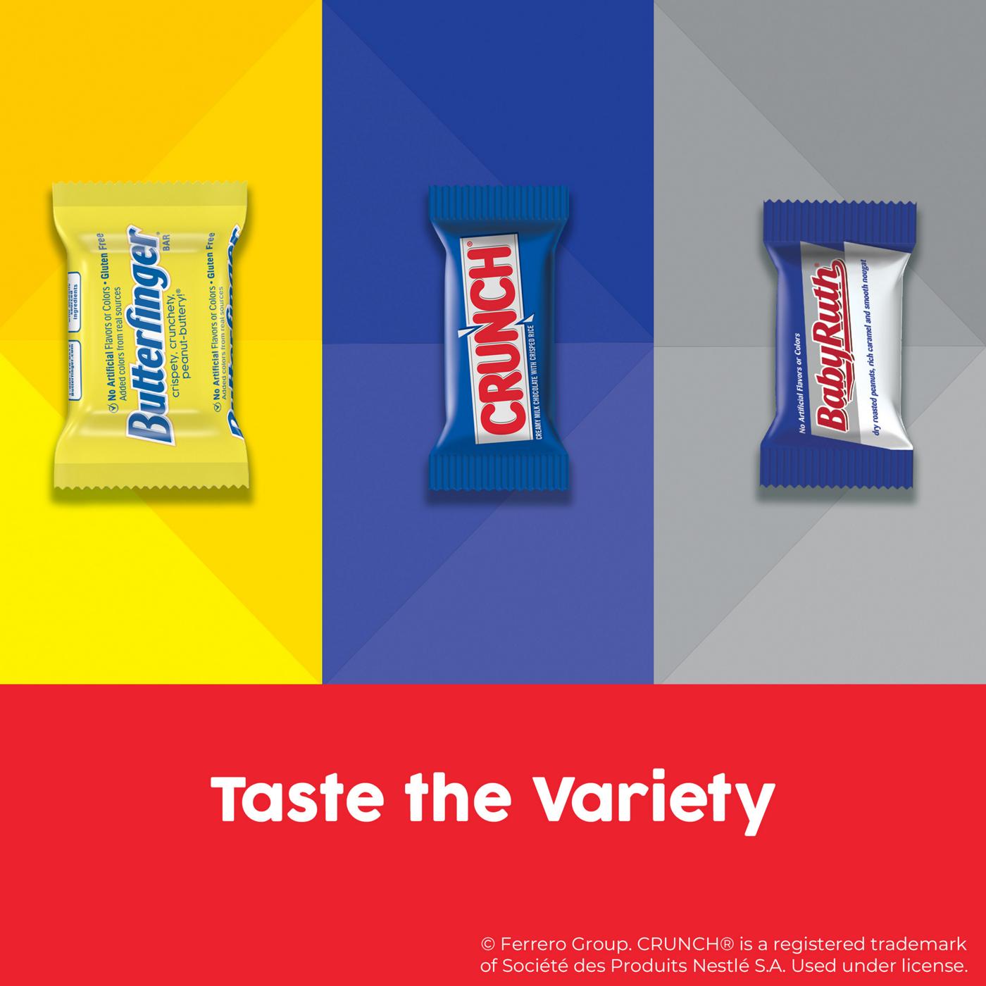 Enjoy the tasty variety of fan favorites like Butterfinger, CRUNCH and Baby Ruth in this 26-count bag of assorted Minis candy bars. Discover a variety of chocolatey candy bars that are perfectly classic and delicious. From peanut-buttery Butterfinger to the chewy, crunchy goodness of Baby Ruth, to the crunchy texture of CRUNCH you know and love, these classic candy bars are individually wrapped. Great for savoring as a treat, reward or during an office break getaway, these irresistible Minis bars also make the perfect candy to share with friends, family and coworkers. Grab a bag of assorted favorites today and add a variety of chocolatey treats to your every day.