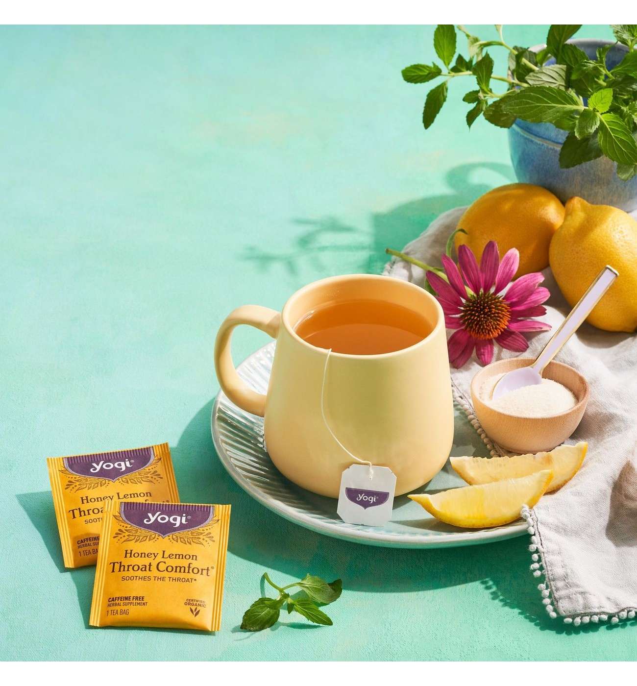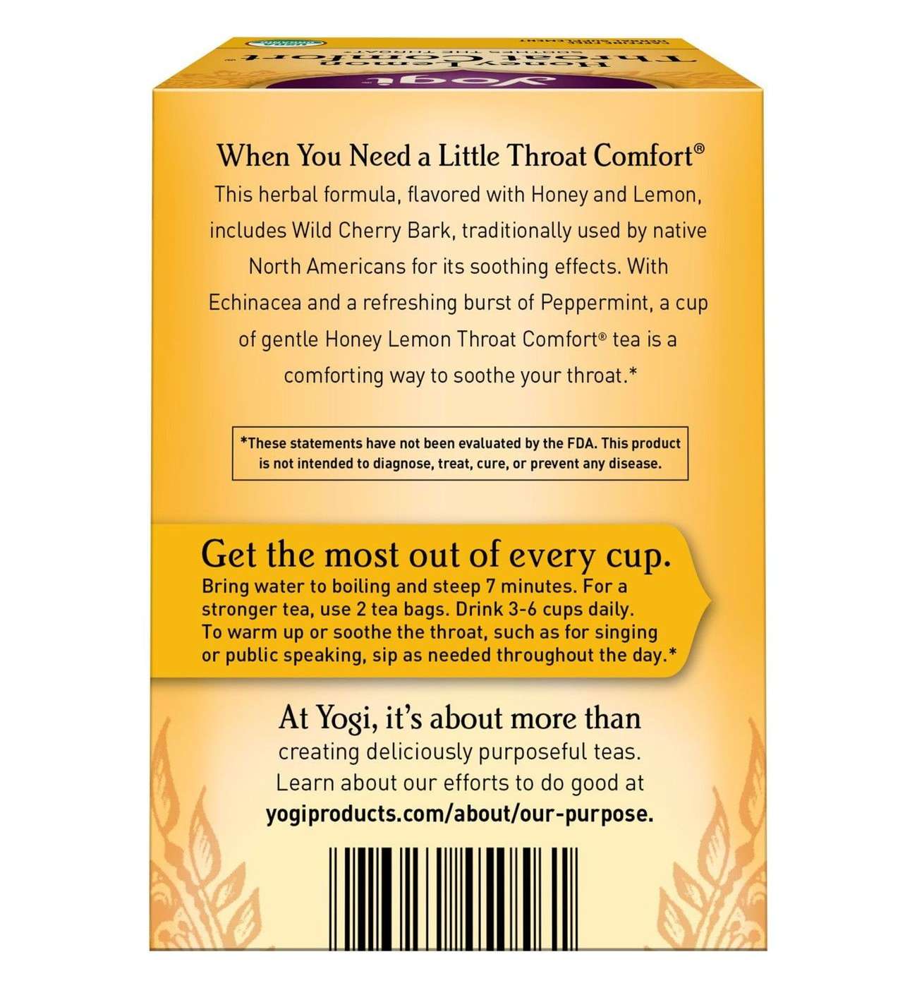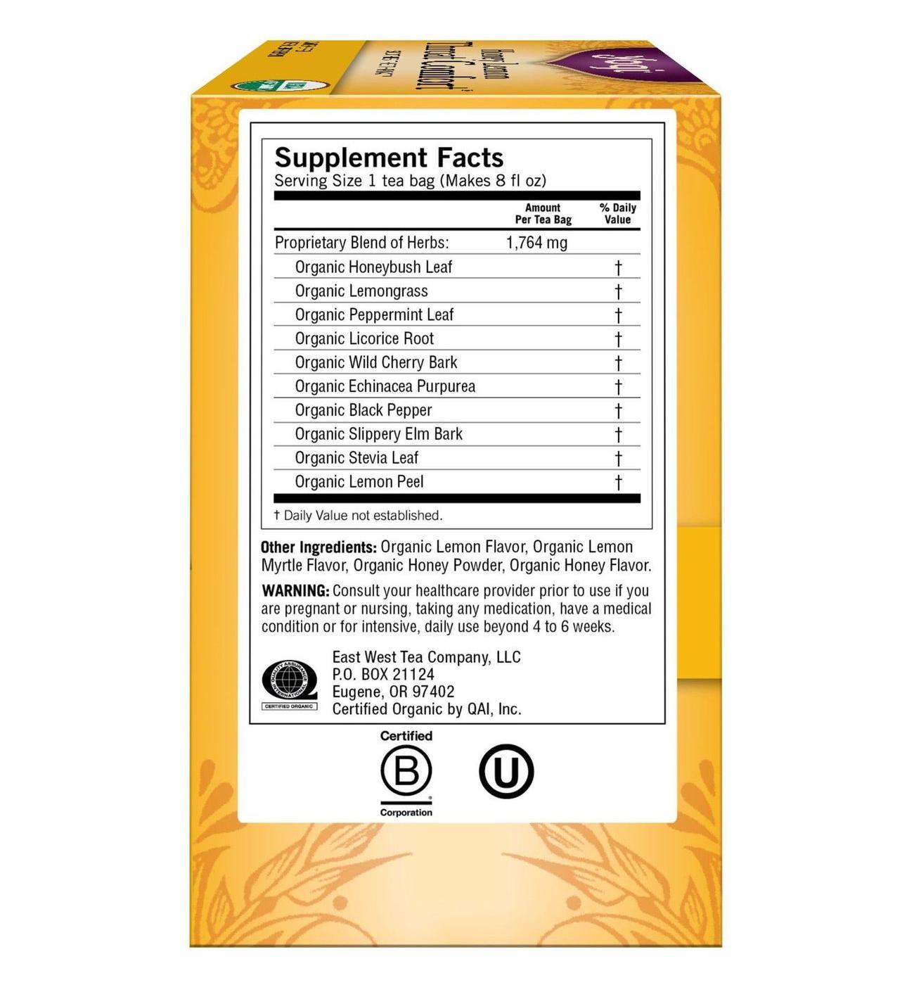 Yogi Honey Lemon Throat Comfort® tea is purposefully blended with Echinacea Purpurea and Wild Cherry Bark; an ingredient traditionally used by native North Americans for its soothing properties. Naturally-sweet Honeybush combines with refreshing Peppermint and notes of Organic Honey and Lemon flavors. Sip Yogi Honey Lemon Throat Comfort® tea for a tasty treat that helps to comfort and soothe your throat.