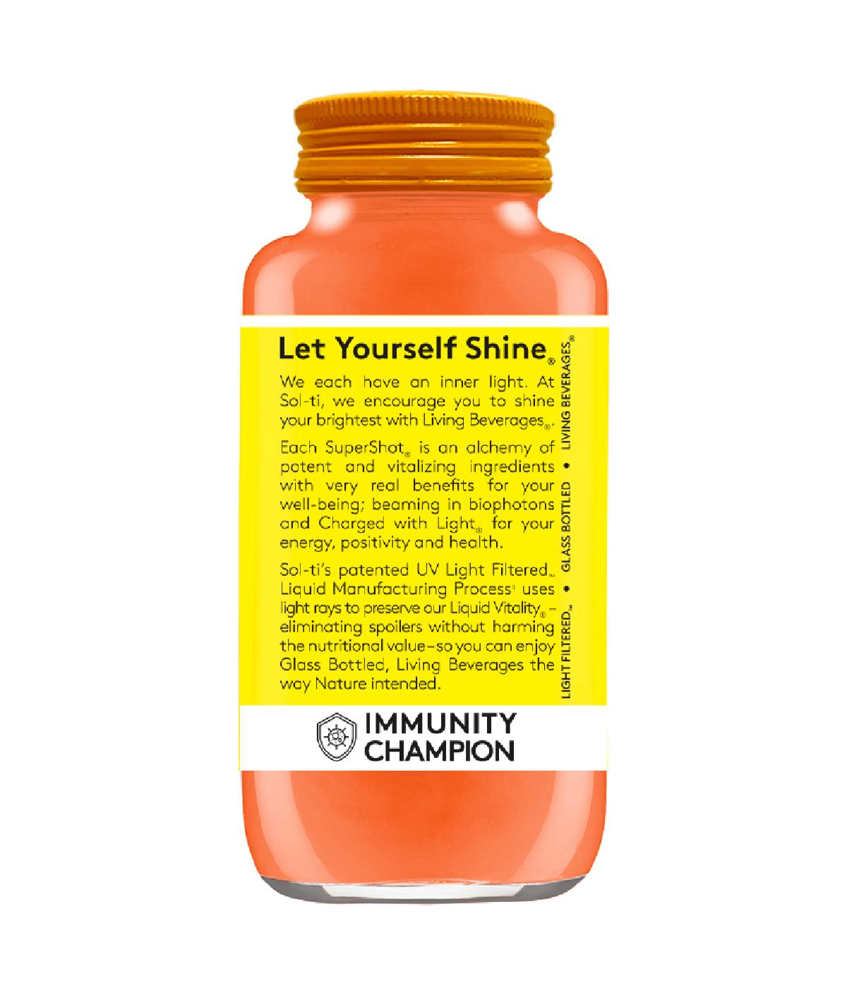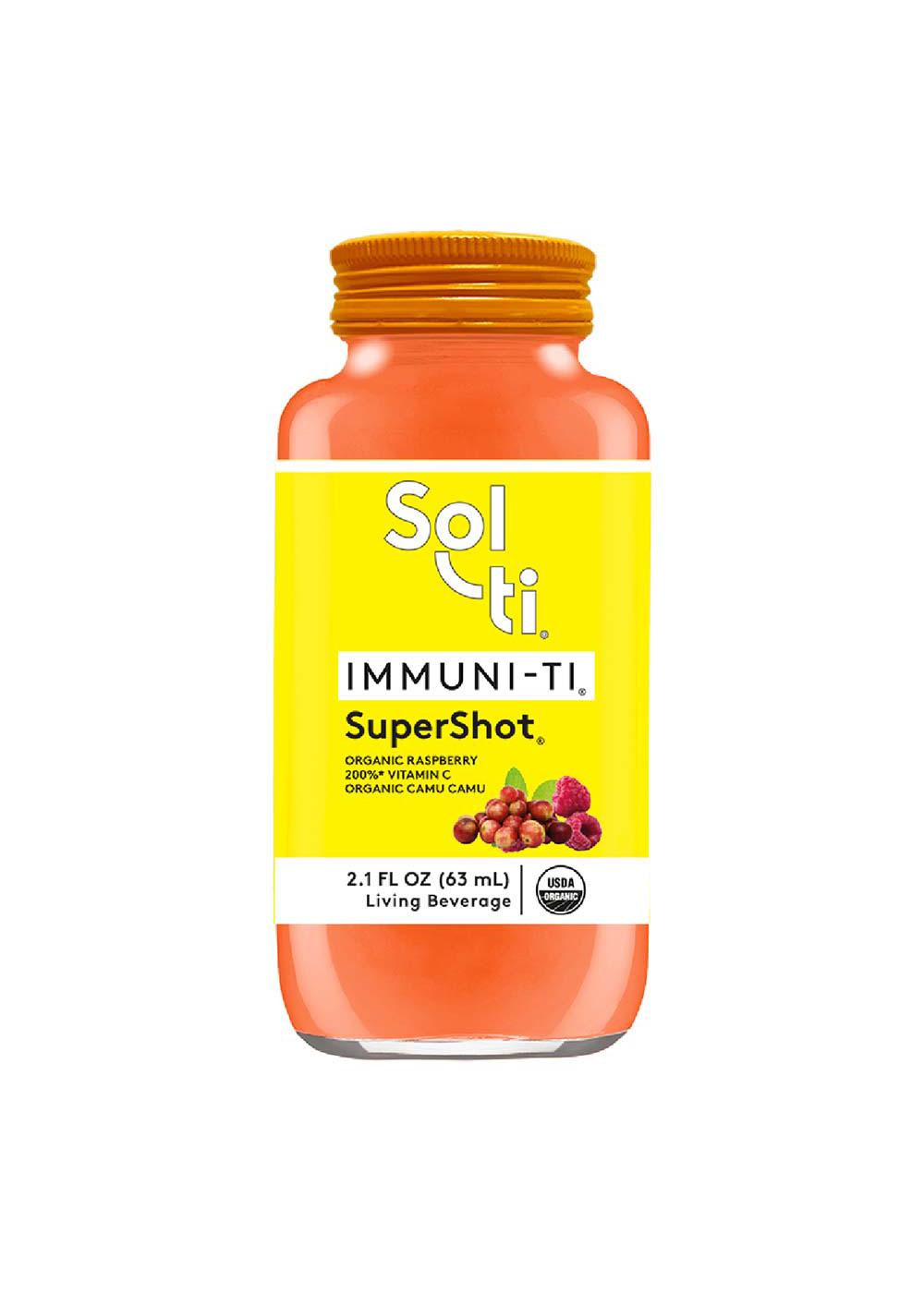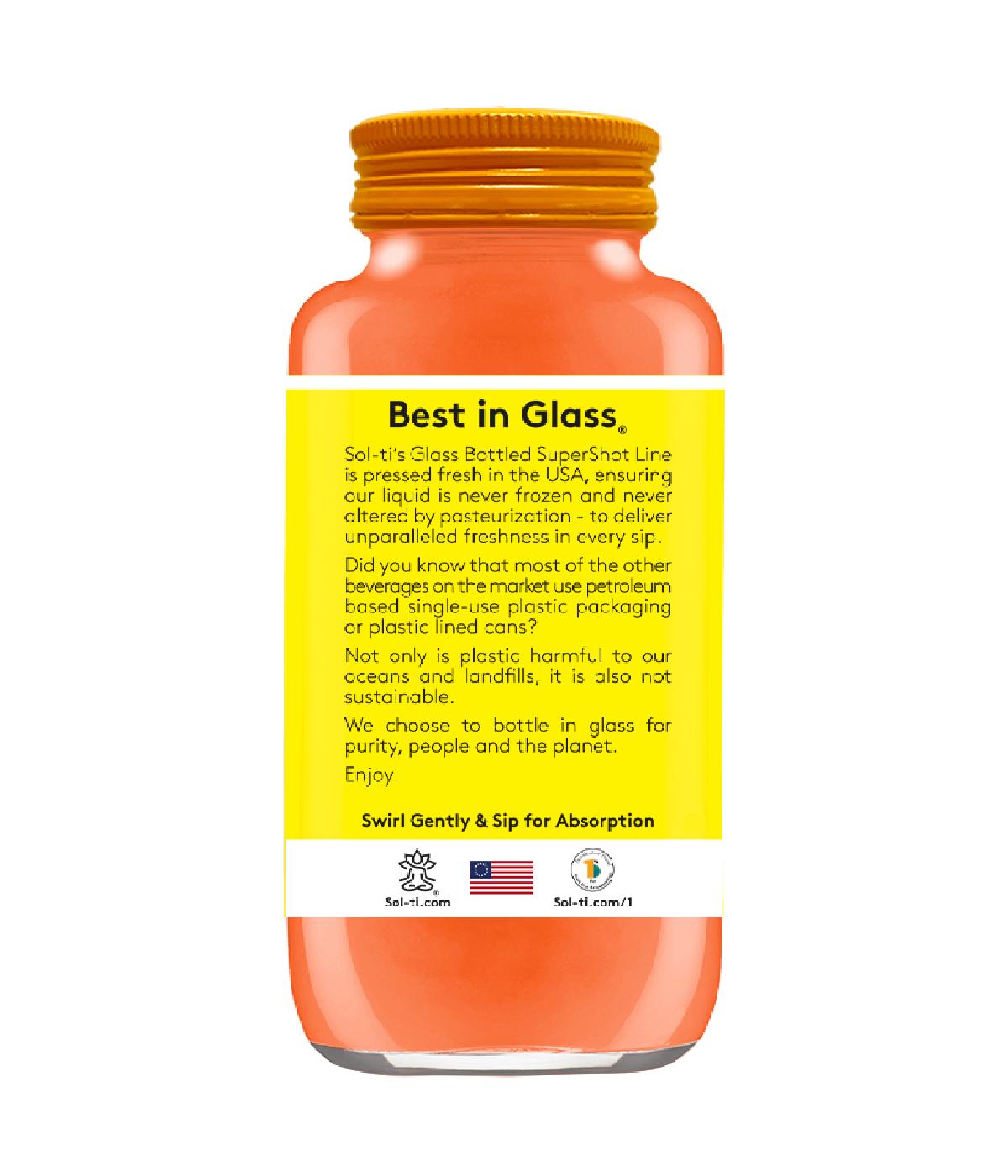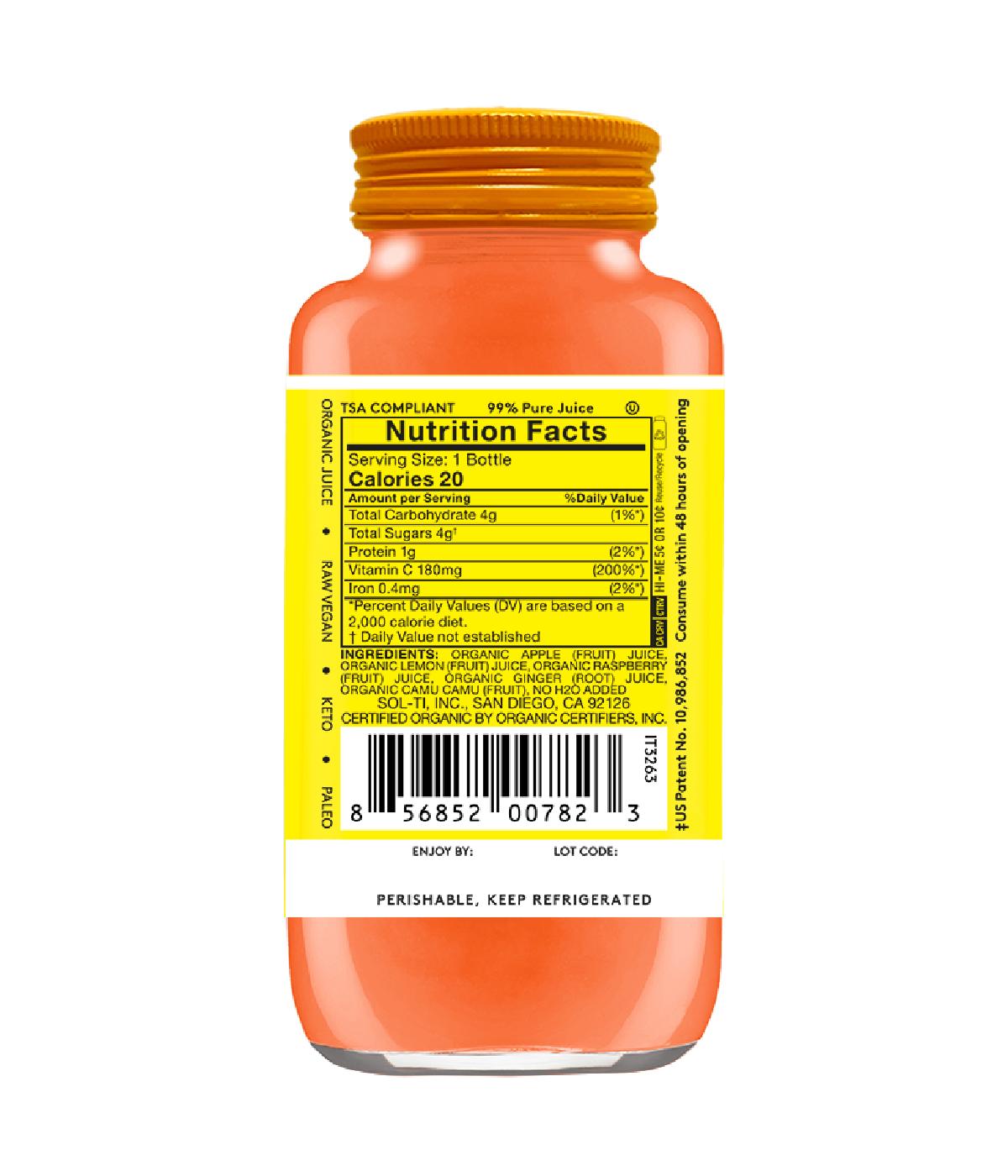 This incredible tart, yet sweet immunity shot is packed with 333mg of Organic Camu Camu and 18,000mg of Freshly Pressed Organic Raspberry, that provide anti-oxidants and 150% Daily Value of Vitamin C!