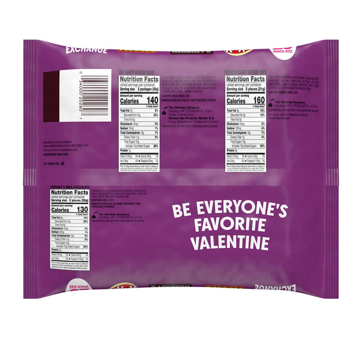 Kit Kat Wafer Bar Snack Size: Contains: milk, wheat, soy. Manufactured in a facility that processes peanuts. Reese's Milk Chocolate Peanut Butter Cup Snacks Size: Contains: peanuts, milk, soy. Hershey's Milk chocolate Snack Size: Contains: milk, soy. Manufactured on the same equipment that processes almonds.