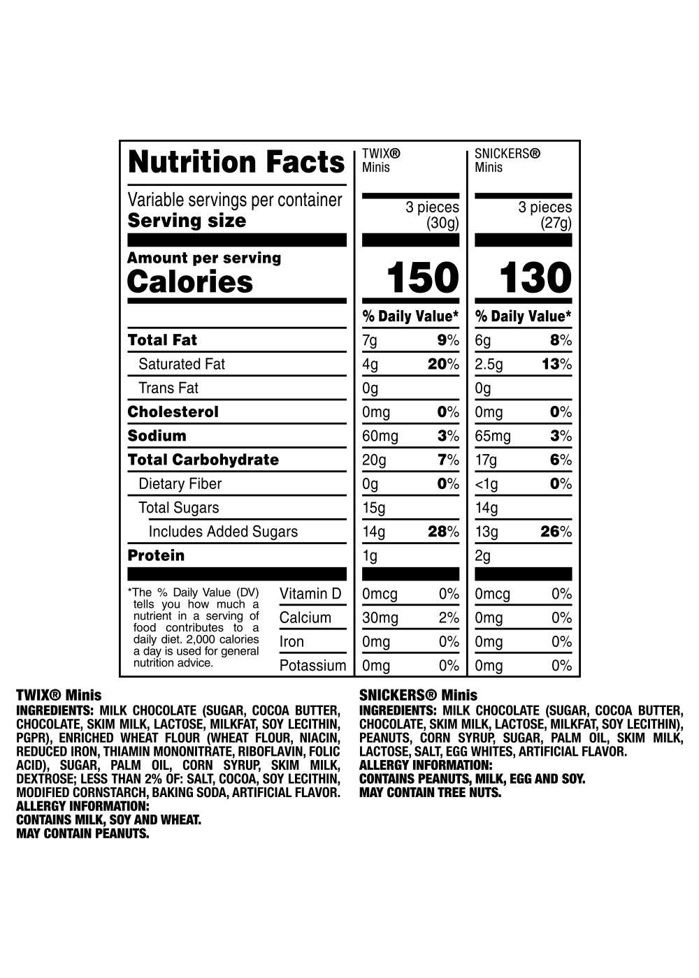Ingredients: Milk Chocolate (Sugar, Cocoa Butter, Chocolate, Skim Milk, Lactose, Milkfat, Soy Lecithin, Pgpr), Enriched Wheat Flour (Wheat Flour, Niacin, Reduced Iron, Thiamin Mononitrate, Riboflavin, Folic Acid), Sugar, Palm Oil, Corn Syrup, Skim Milk, Dextrose; Less Than 2% Of: Salt, Cocoa, Soy Lecithin, Modified Cornstarch, Baking Soda, Artificial Flavor. Ingredients: Milk Chocolate (Sugar, Cocoa Butter, Chocolate, Skim Milk, Lactose, Milkfat, Soy Lecithin), Peanuts, Corn Syrup, Sugar, Palm Oil, Skim Milk, Lactose, Salt, Egg Whites, Artificial Flavor.Allergens and safety warnings