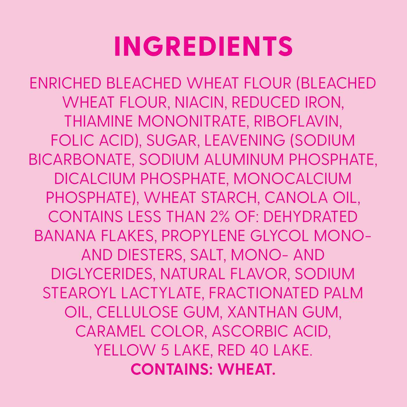 Enriched Bleached Wheat Flour (Bleached Wheat Flour, Niacin, Reduced Iron, Thiamine Mononitrate, Riboflavin, Folic Acid), Sugar, Leavening (Sodium Bicarbonate, Sodium Aluminum Phosphate, Dicalcium Phosphate, Monocalcium Phosphate), Wheat Starch, Canola Oil, Contains Less than 2% of: Dehydrated Banana Flakes, Propylene Glycol Mono- and Diesters, Salt, Mono-and Diglycerides, Natural Flavor, Sodium Stearoyl Lactylate, Fractionated Palm Oil, Cellulose Gum, Xanthan Gum, Caramel Color, Ascorbic Acid, Yellow 5 Lake, Red 40 Lake.Allergens and safety warnings