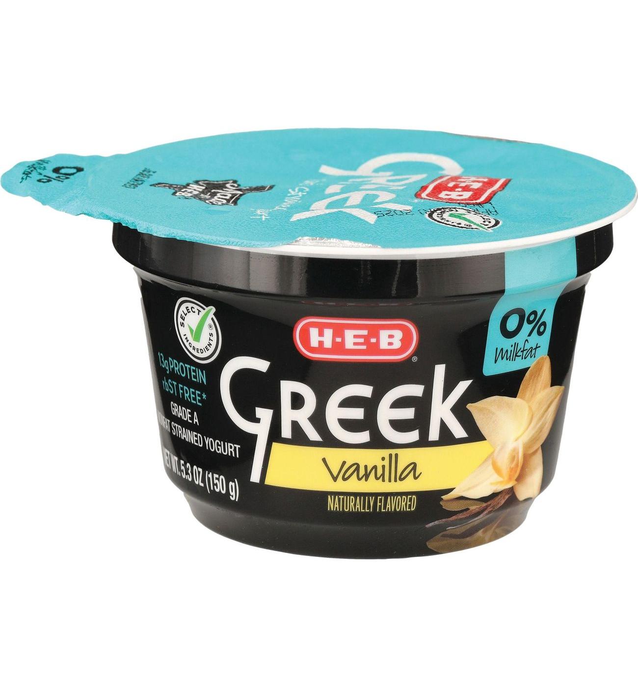 Offering 13 grams of protein per serving, H-E-B nonfat vanilla Greek yogurt is a convenient take-along snack. Super thick and creamy with the rich taste of vanilla, it's made with rBST-free* milk and contains live and active cultures.