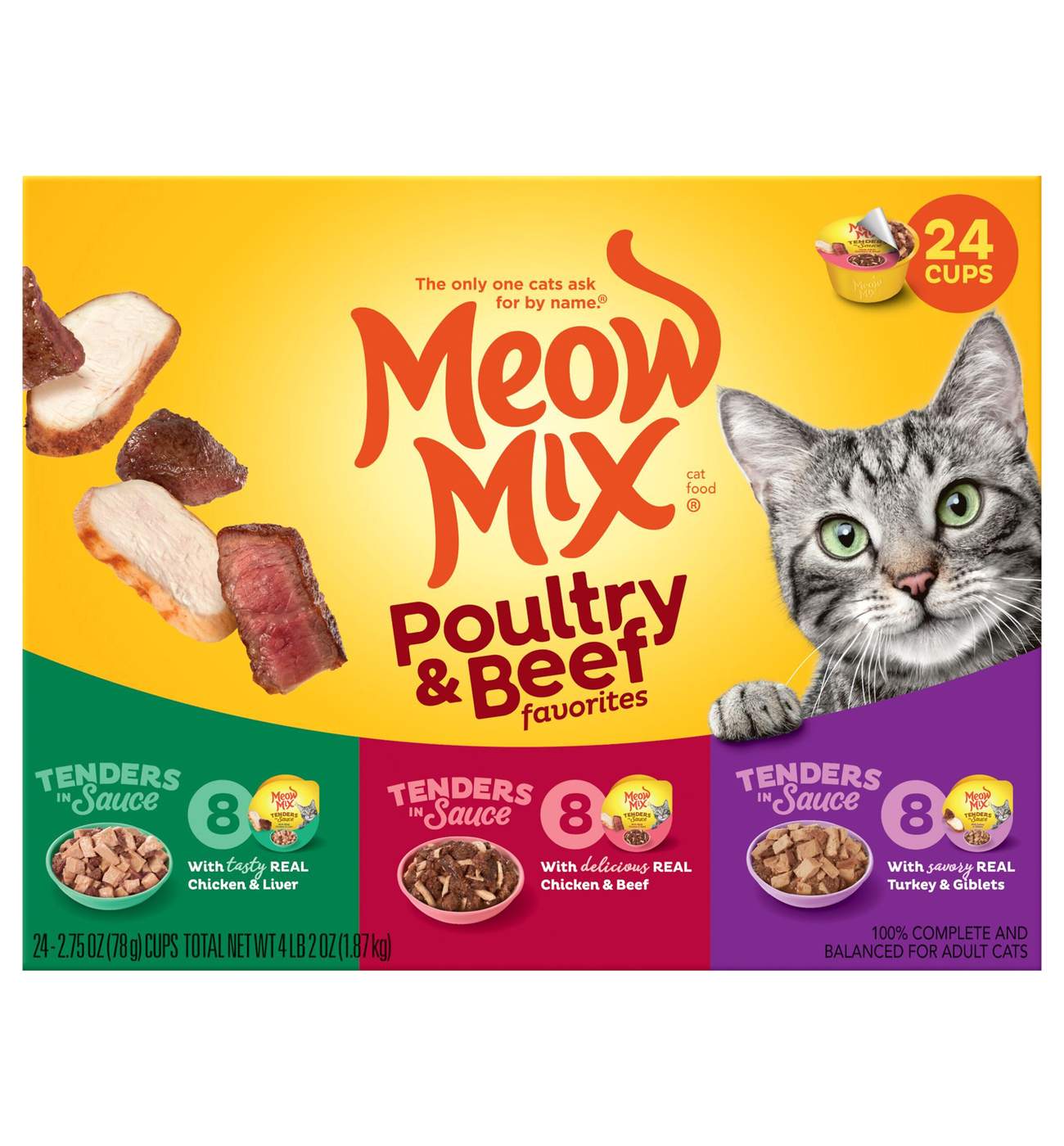 Our Tender Favorites® Poultry & Beef Variety Pack has the perfect mix of tastes your cat will love. Made with juicy pieces of real chicken beef or turkey these mixes make every mealtime irresistibly delicious.