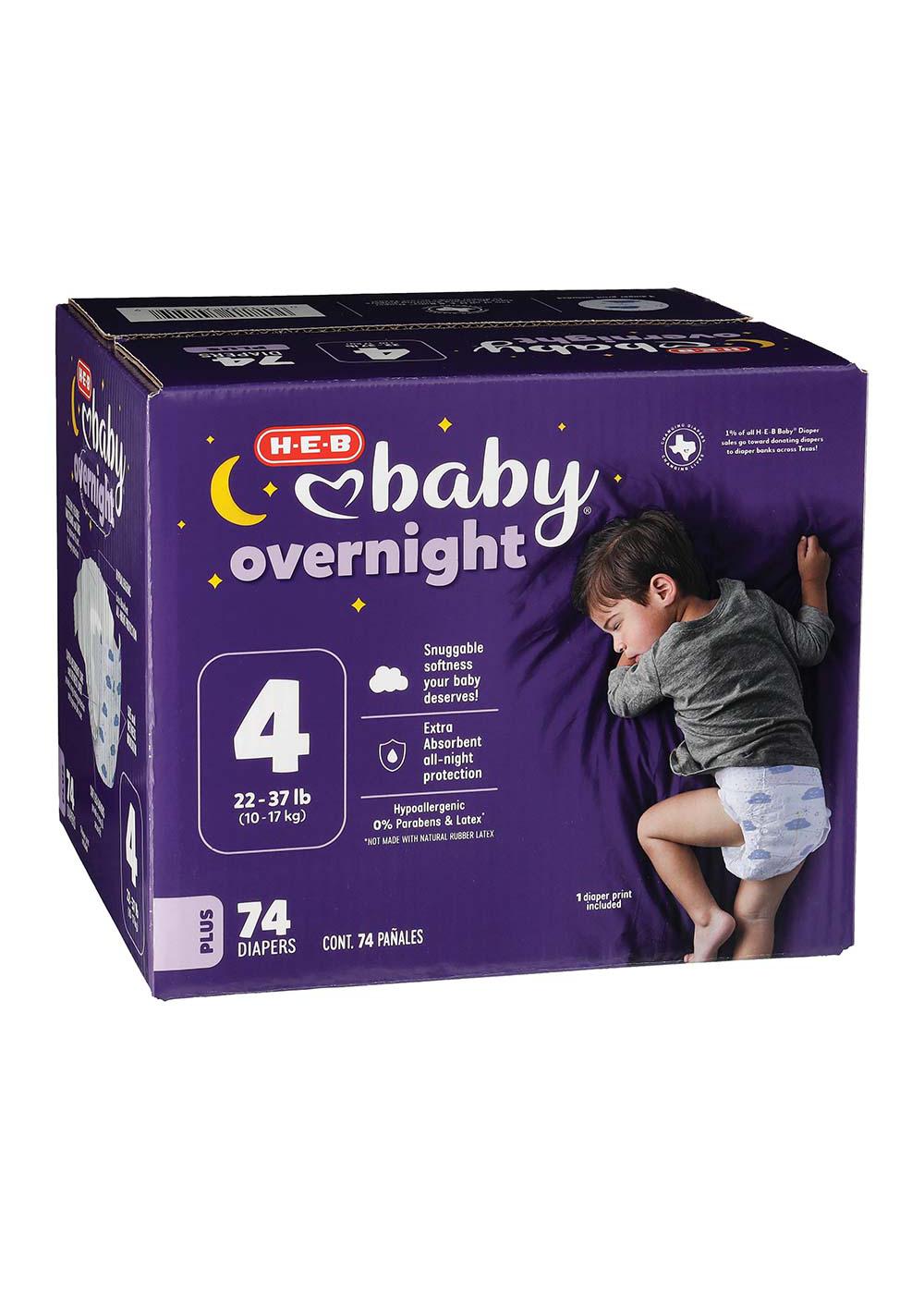 These H-E-B size 4 overnight diapers provide your baby with softness and leakage protection that adapts to movement while they sleep. In the event of an overnight accident, the wetness indicator turns from yellow to blue when it’s time for a diaper change. Topping things off, the stretchy, flexible waistband and tabs offer an optimum fit for maximum comfort.