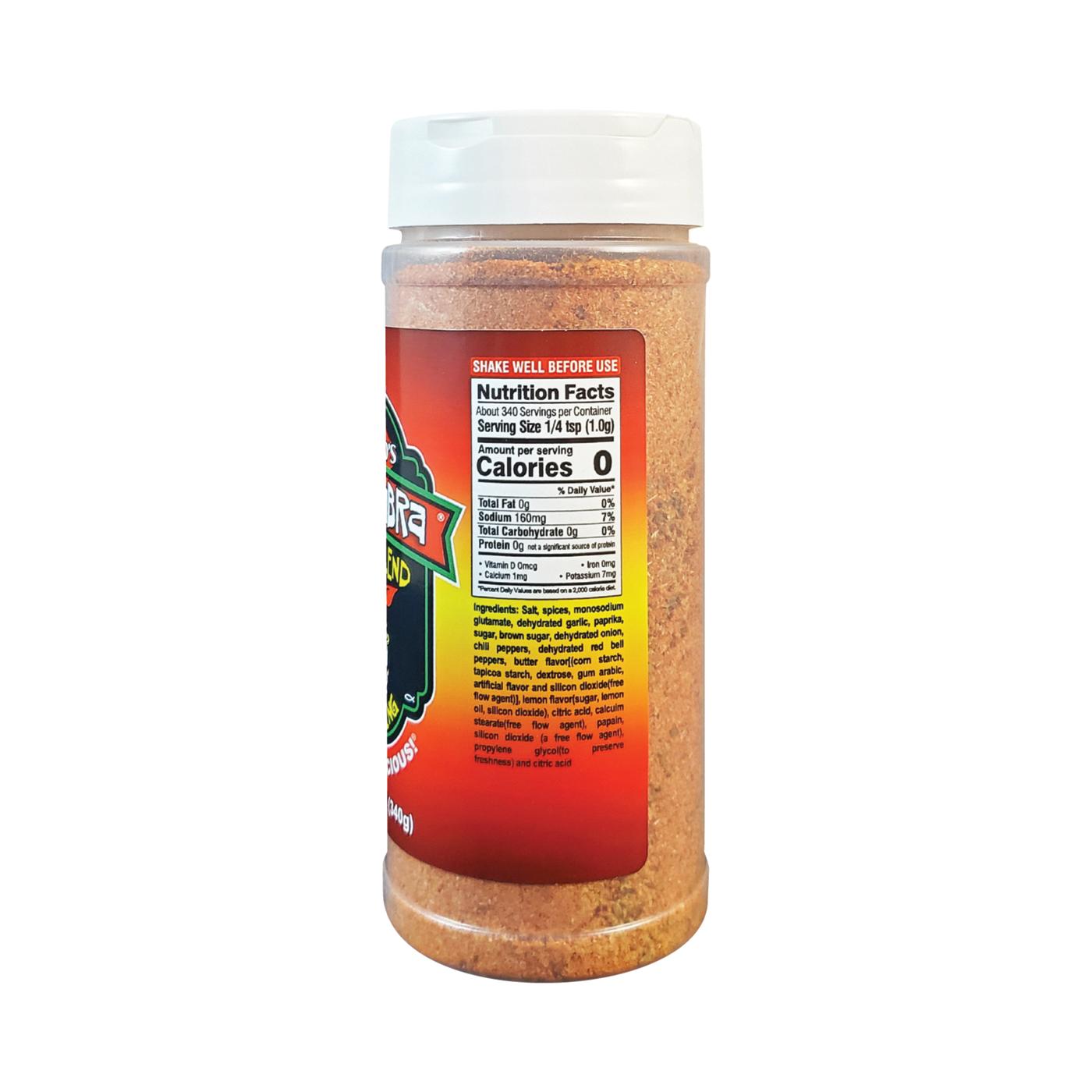 Salt, Spices, Monosodium Glutamate, Dehydrated Garlic, Paprika, Sugar, Brown Sugar, Onion, Chili Peppers, Dehydrated Red Bell Peppers, Lemon Flavor (Sugar, Lemon Oil), Citric Acid, Papain, Propylene Glycol (To Preserve Freshness, Artificial Butter Flavor, Less Than 2% Calcium Stearate And Silicon Dioxide Added As Processing Aids.