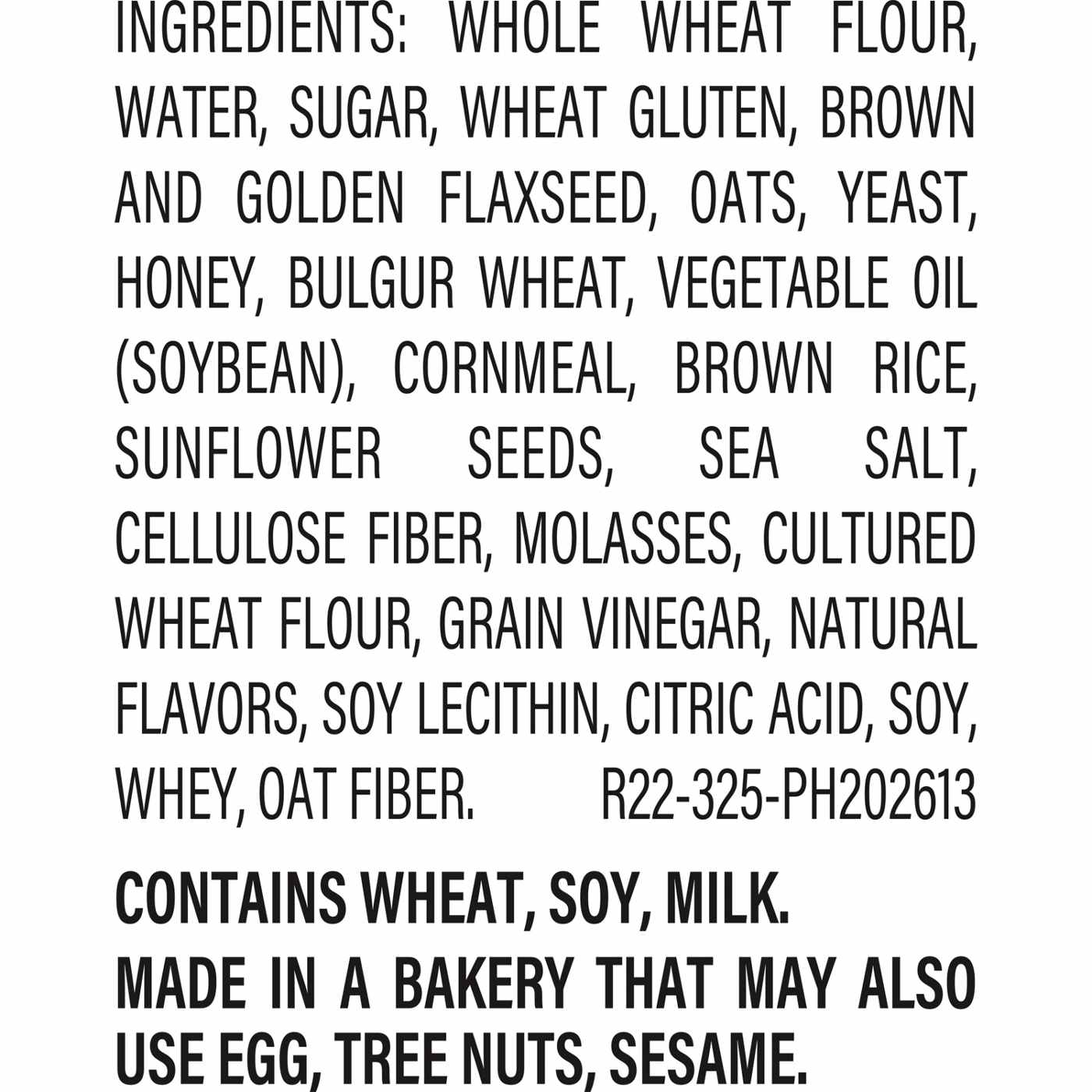 Whole Wheat Flour, Water, Wheat Gluten, Sugar, Brown And Golden Flaxseed, Oats, Honey, Yeast, Bulgur Wheat, Vegetable Oil (Soybean), Cornmeal, Brown Rice, Sea Salt, Natural Flavors, Oat Fiber, Fermented Wheat Flour, Sunflower Seeds, Grain Vinegar, Soy Lecithin, Citric Acid, Soy, Whey.Allergens and safety warnings