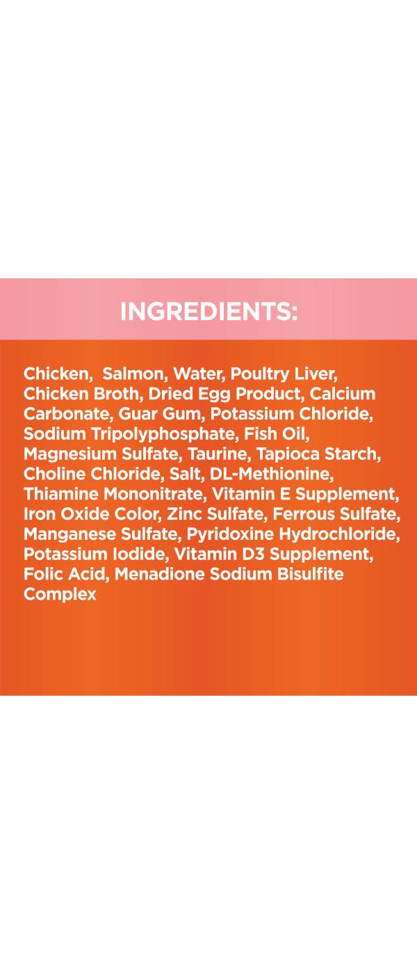 Chicken, Salmon, Water, Poultry Liver, Chicken Broth, Dried Egg Product, Calcium Carbonate, Guar Gum, Potassium Chloride, Sodium Tripolyphosphate, Fish Oil, Magnesium Sulfate, Taurine, Tapioca Starch, Choline Chloride, Salt, DL-Methionine, Thiamine Mononitrate, Vitamin E Supplement, Iron Oxide Color, Zinc Sulfate, Ferrous Sulfate, Manganese Sulfate, Pyridoxine Hydrochloride, Potassium Iodide, Vitamin D3 Supplement, Folic Acid, Menadione Sodium Bisulfite ComplexAllergens and safety warnings