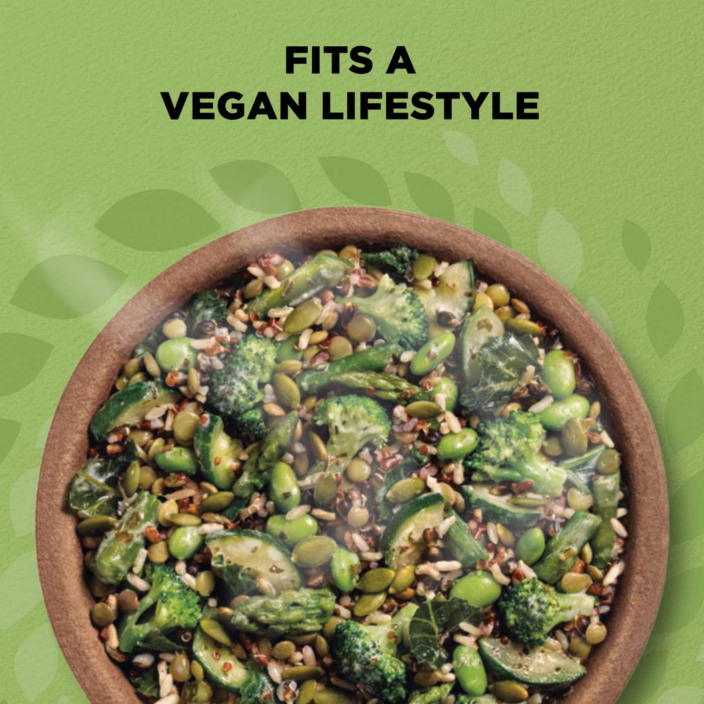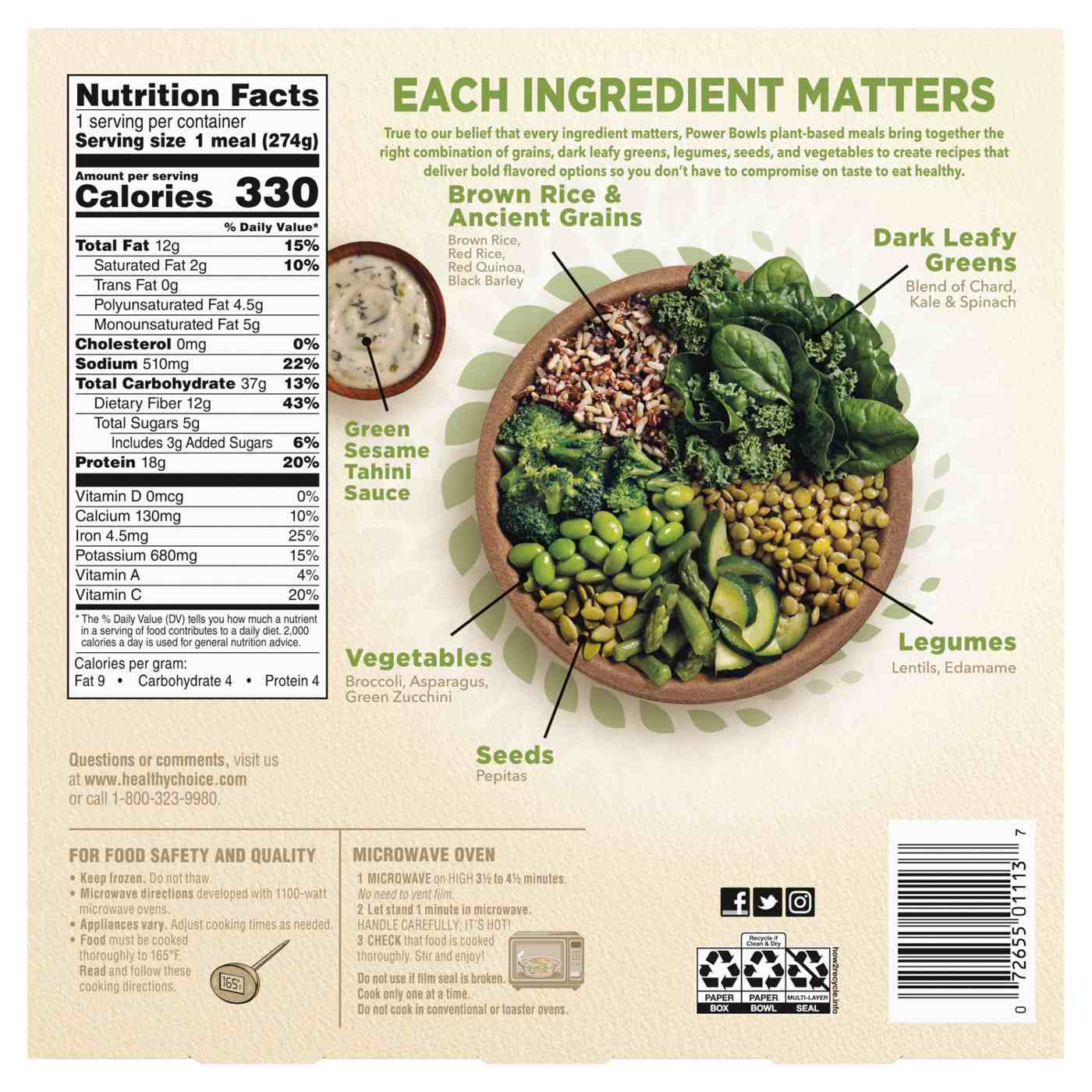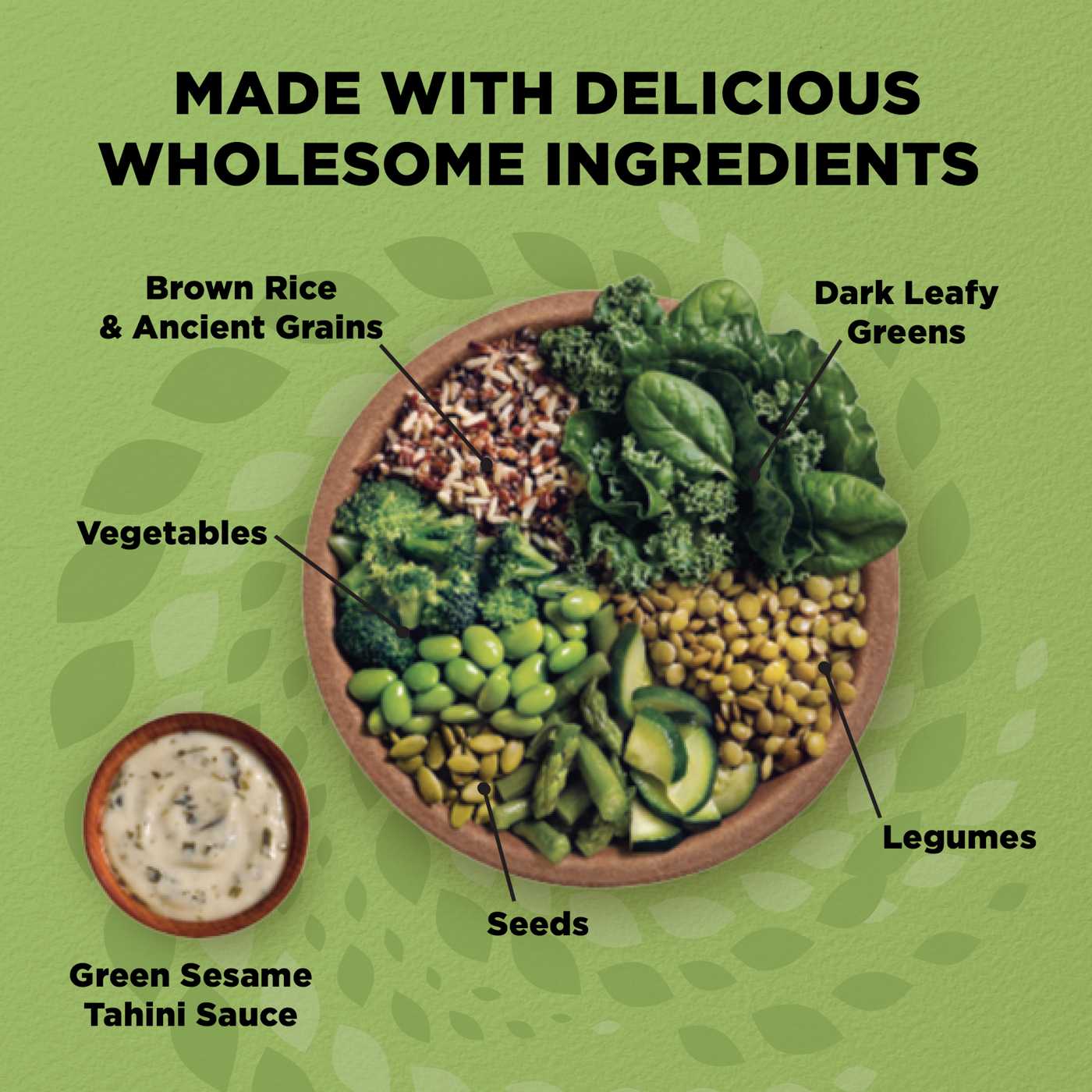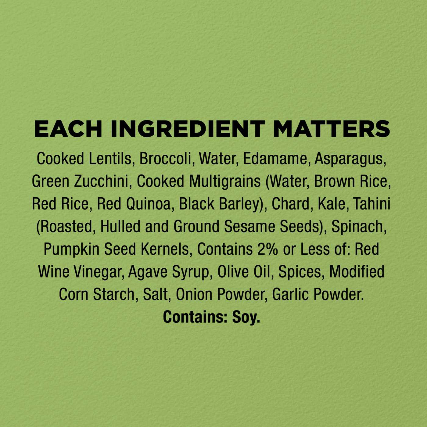 Cooked Lentils, Broccoli, Water, Edamame, Asparagus, Green Zucchini, Cooked Multigrains (Water, Brown Rice, Red Rice, Red Quinoa, Black Barley), Chard, Kale, Tahini (Roasted, Hulled and Ground Sesame Seeds), Spinach, Pumpkin Seed Kernels, Contains 2% or Less of: Red Wine Vinegar, Agave Syrup, Olive Oil, Spices, Modified Corn Starch, Salt, Onion Powder, Garlic Powder.Allergens and safety warnings