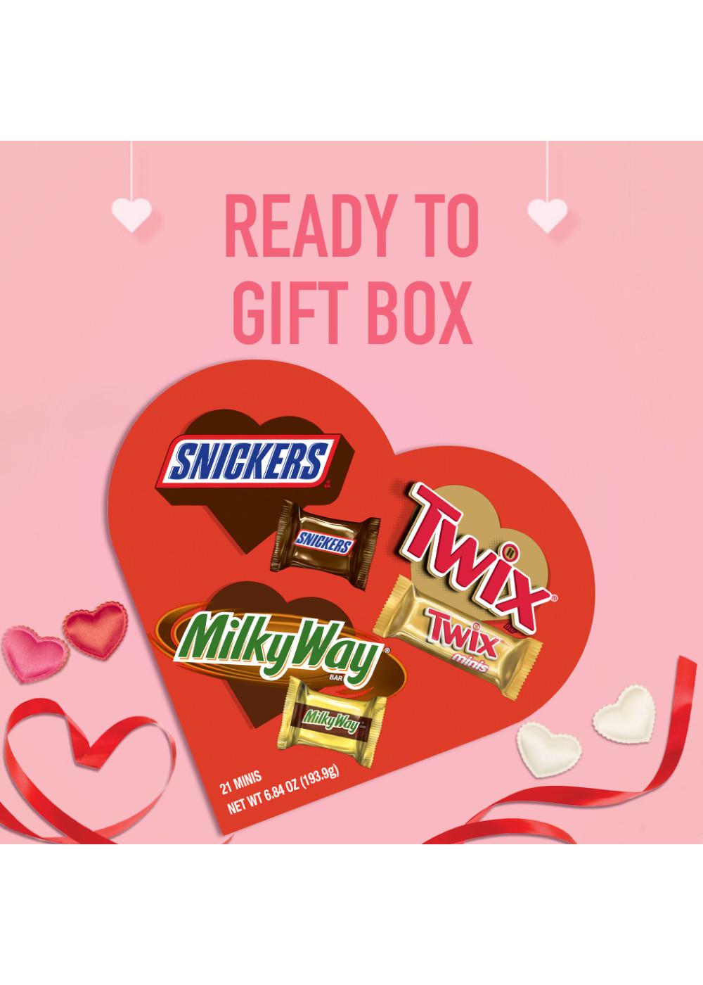 • Contains one (1) 6.84-ounce, 21-count assortment of SNICKERS, TWIX & MILKY WAY Minis Valentine's Day Chocolate Bars