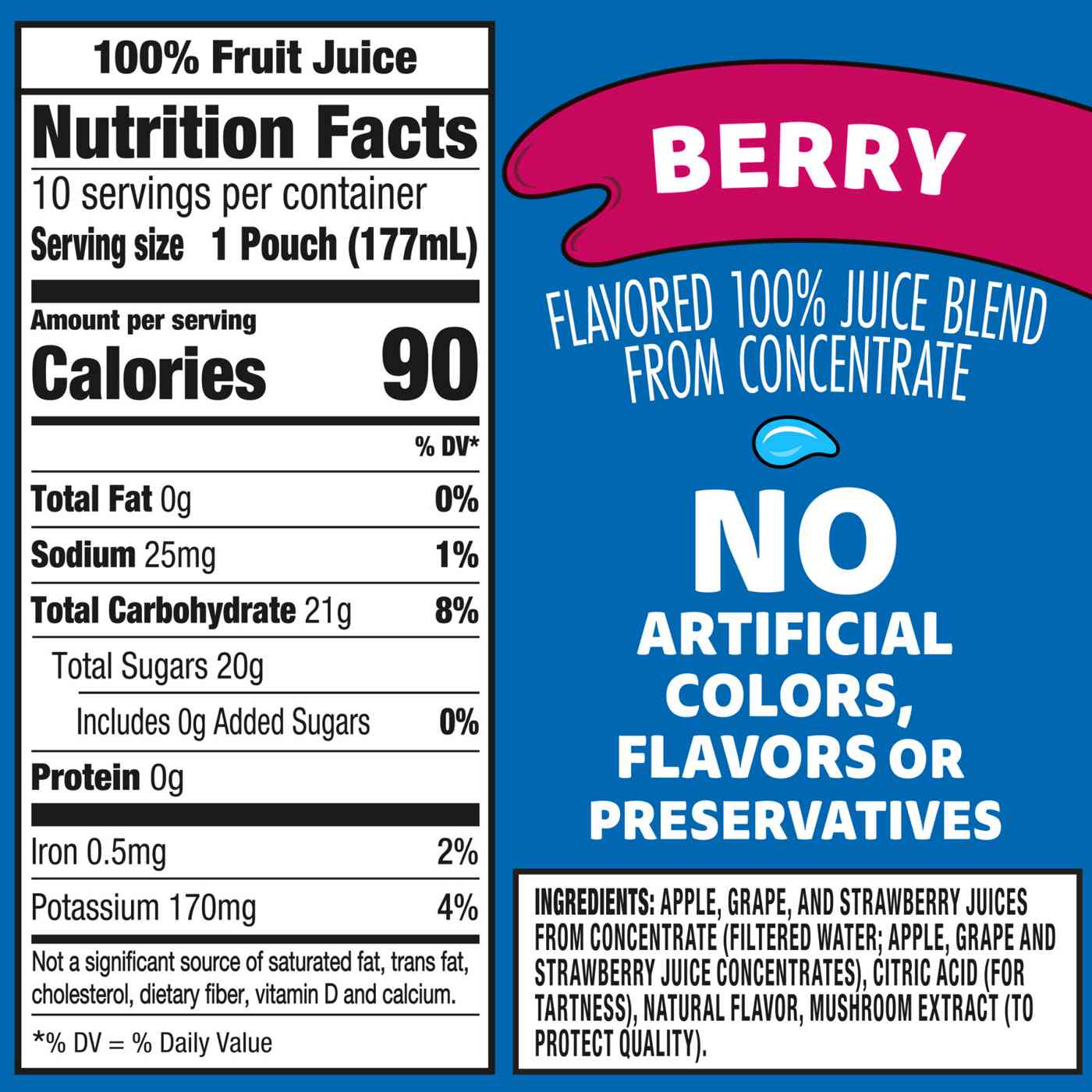 • One 10 ct box of Berry Flavored 100% Juice Blend From Concentrate With Added Ingredients And Other Natural Flavor6 fl oz pouches)