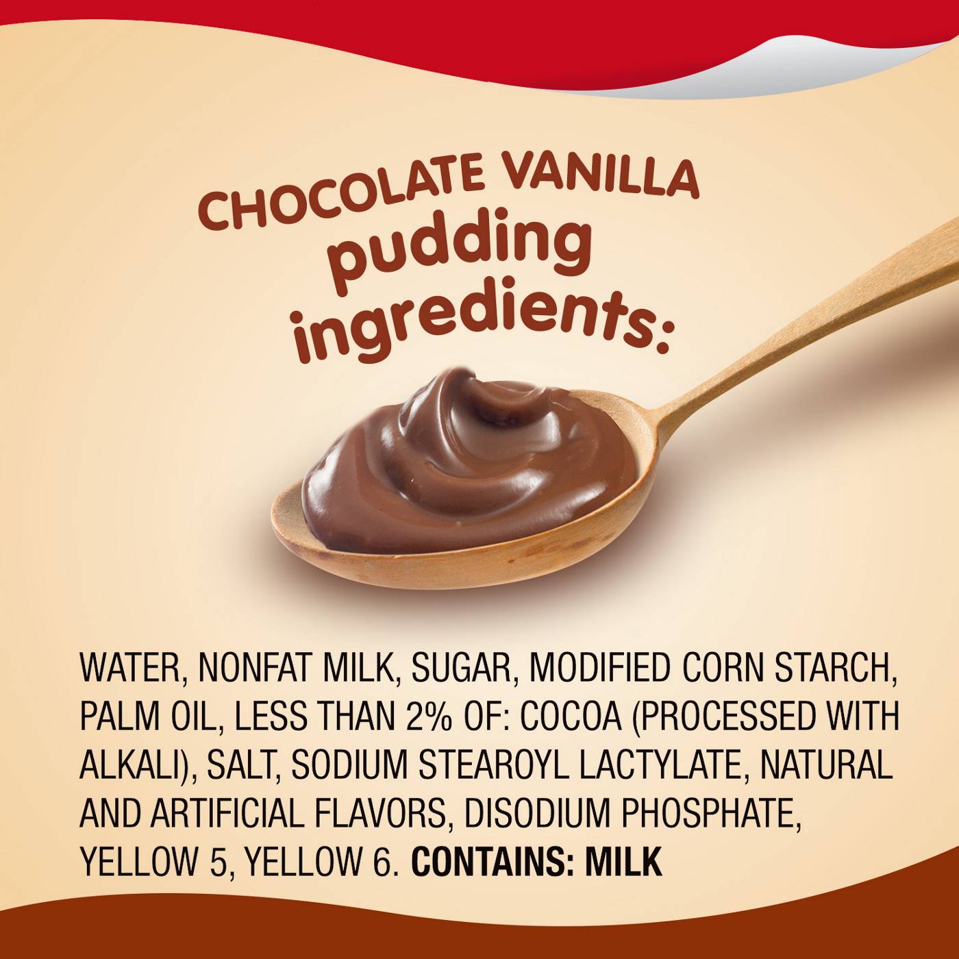 Water, Nonfat Milk, Sugar, Modified Corn Starch, Palm Oil, Less than 2% of: Cocoa (Processed with Alkali), Salt, Sodium Stearoyl Lactylate, Natural and Artificial Flavors, Disodium Phosphate, Yellow 5, Yellow 6.Allergens and safety warnings
