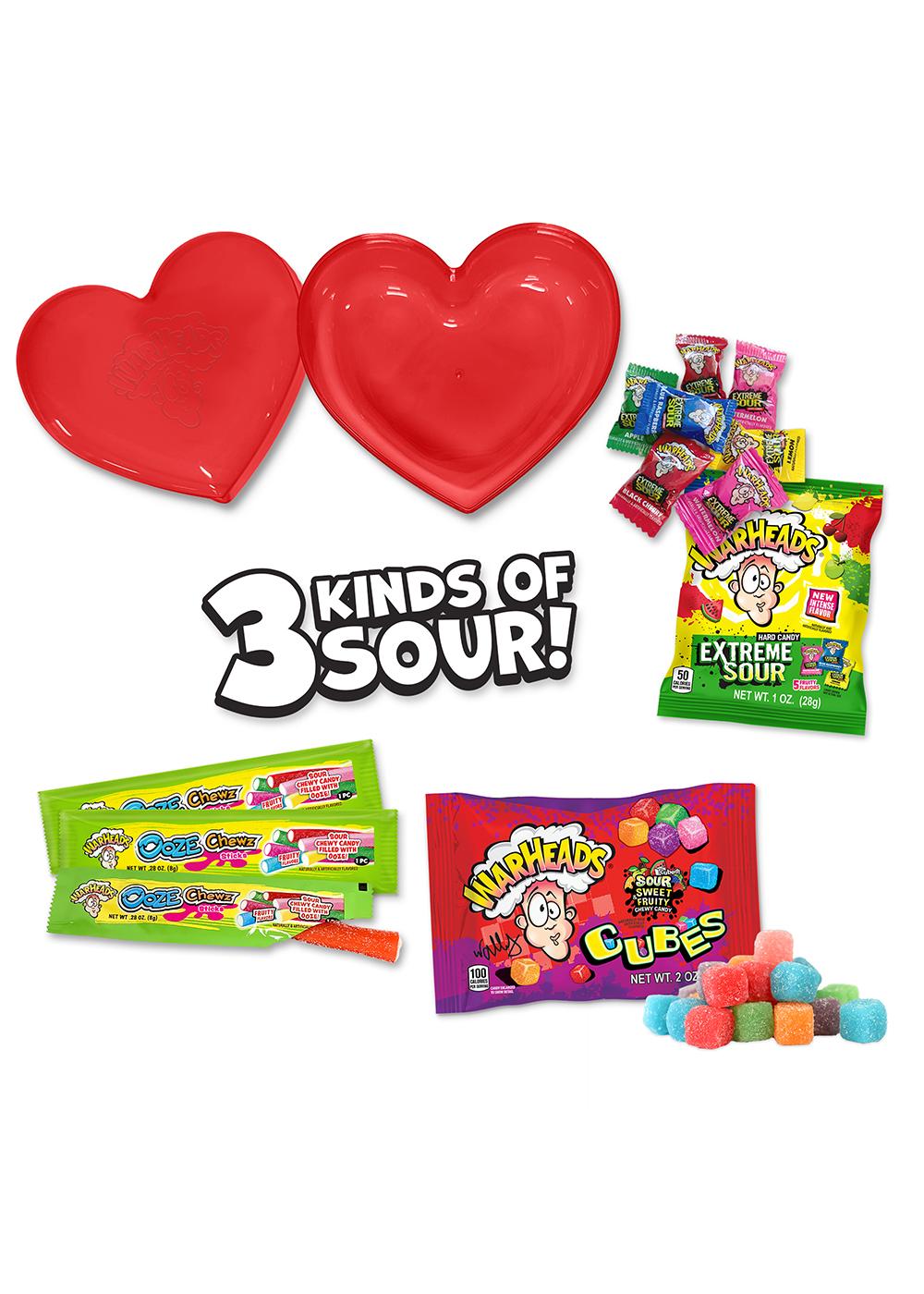 3 great sour candies in every heart! • Extreme Sour Hard Candy • Chewy Cubes • Ooze Chewz • Recommended for ages 4+