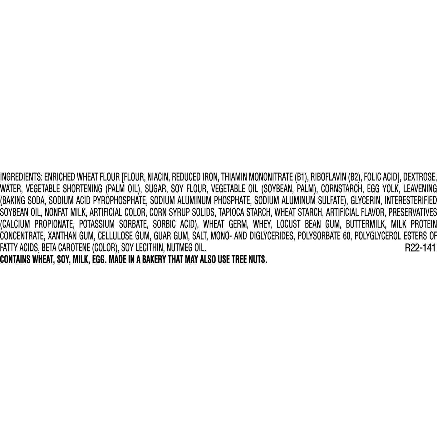 Enriched Wheat Flour [Flour, Niacin, Reduced Iron, Thiamin Mononitrate (B1), Riboflavin (B2), Folic Acid], Dextrose, Water, Vegetable Shortening (Palm Oil), Sugar, Soy Flour, Vegetable Oil [Soybean, Palm], Cornstarch, Egg Yolk, Leavening [Baking Soda, Sodium Acid Pyrophosphate, Sodium Aluminum Phosphate, Sodium Aluminum Sulfate], Glycerin, Interesterified Soybean Oil, Nonfat Milk, Artificial Color, Corn Syrup Solids, Tapioca Starch, Wheat Starch, Artificial Flavor, Preservatives [Calcium Propionate, Potassium Sorbate, Sorbic Acid], Wheat Germ, Whey, Locust Bean Gum, Buttermilk, Milk Protein Concentrate, Xanthan Gum, Cellulose Gum, Guar Gum, Salt, Mono- And Diglycerides, Polysorbate 60, Polyglycerol Esters Of Fatty Acids, Beta Carotene (Color), Soy Lecithin, Nutmeg Oil.Allergens and safety warnings