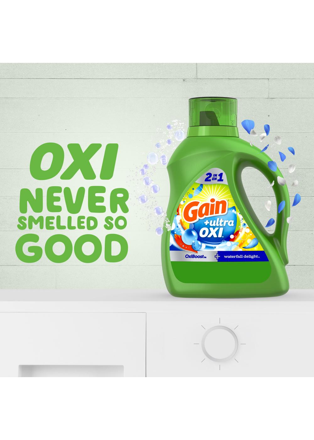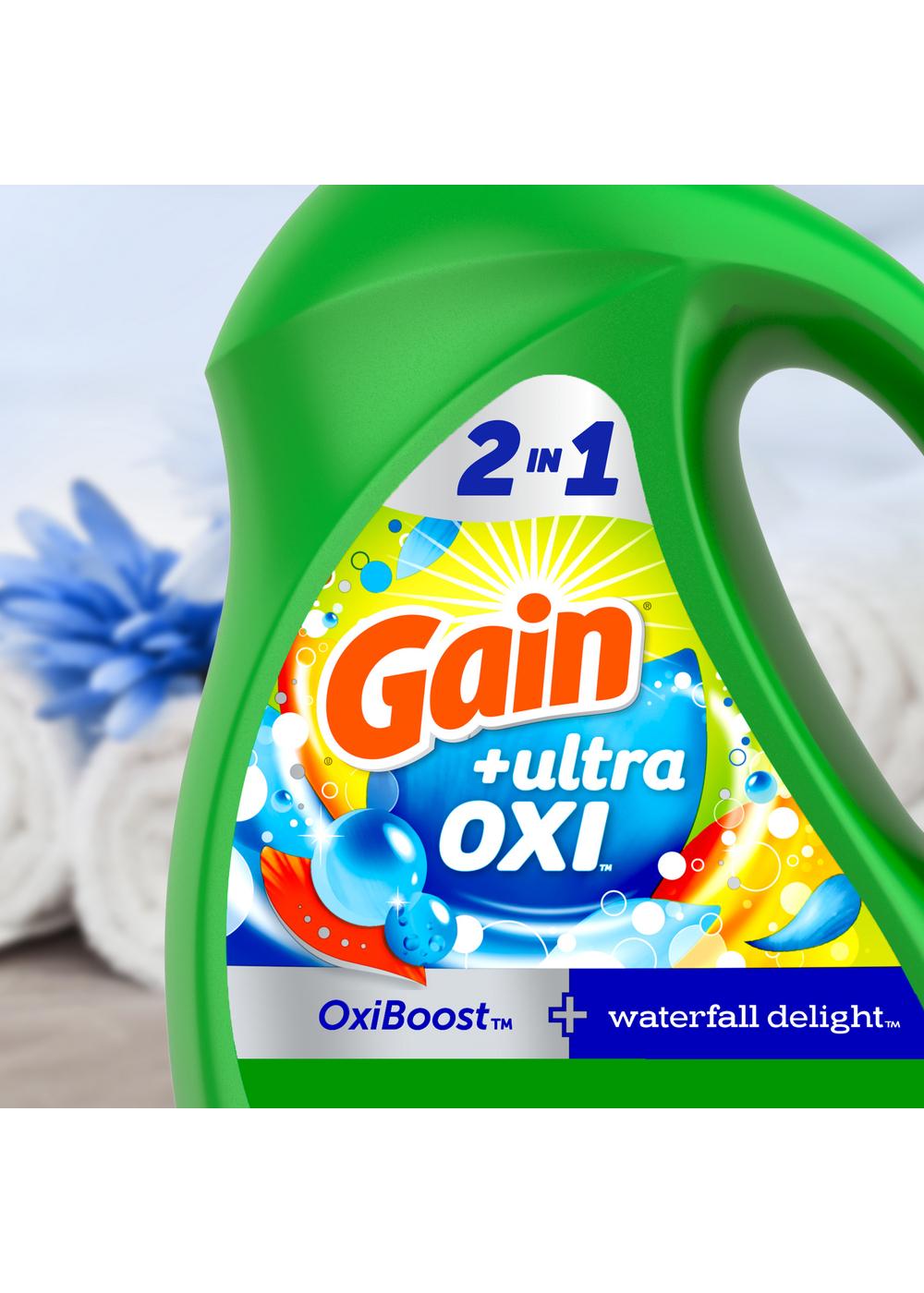 Gain Ultra OXI Liquid Laundry Detergent Waterfall Delight Scent 2-in-1 HE Compatible Laundry Soap is designed with oxi power to lift away stubborn dirt, infusing giving your clothes with an amazing Gain Waterfall Delight scent that's sure to become one of your favorites. Gain Ultra OXI Laundry Detergent's 2-in-1 Ultra OXI & Waterfall Delight scent is an HE laundry detergent compatible with all high-efficiency washers, giving you a freshness you can count on. Experience for yourself the crisp, waterfall-freshness of Gain Ultra OXI Liquid Laundry Detergent Waterfall Delight scent today.