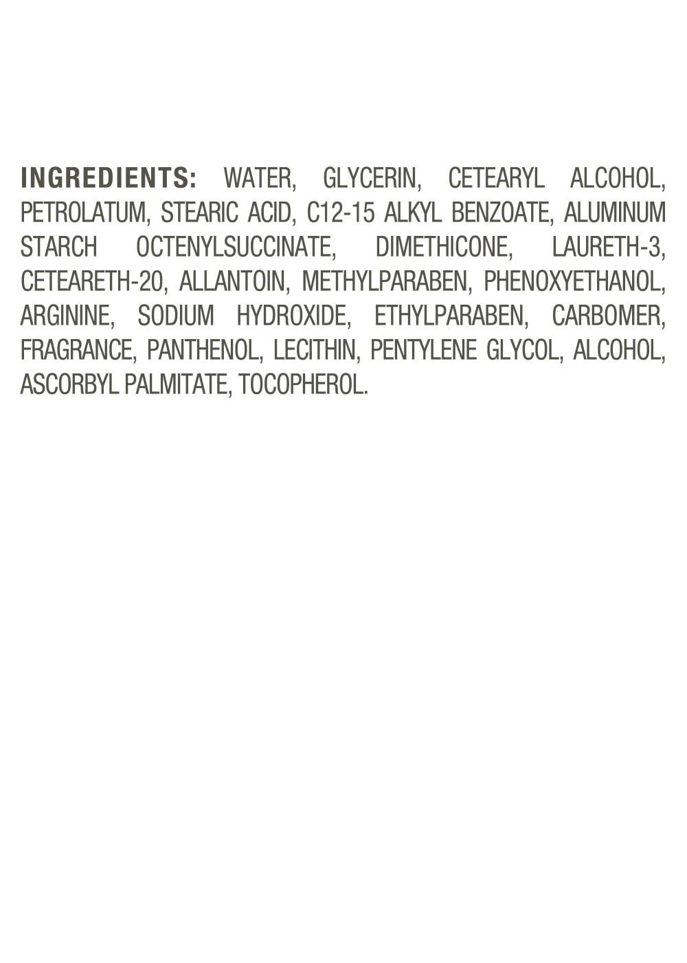 Water, Glycerin, Cetearyl Alcohol, Petrolatum, Stearic Acid, C12-15 Alkyl Benzoate, Aluminum Starch Octenylsuccinate, Dimethicone, Laureth-3, Caprylic/Capric Triglyceride, Hydroxyacetophenone, Ceteareth-20, Allantoin, Arginine, Sodium Hydroxide, Carbomer, Fragrance, Tetrasodium Glutamate Diacetate, Panthenol, Lecithin, Pentylene Glycol, Alcohol, Ascorbyl Palmitate, Tocopherol, Phenoxyethanol, Alpha-Isomethyl Ionone, Benzyl Benzoate, Citronellol, Hexyl Cinnamal, Linalool.