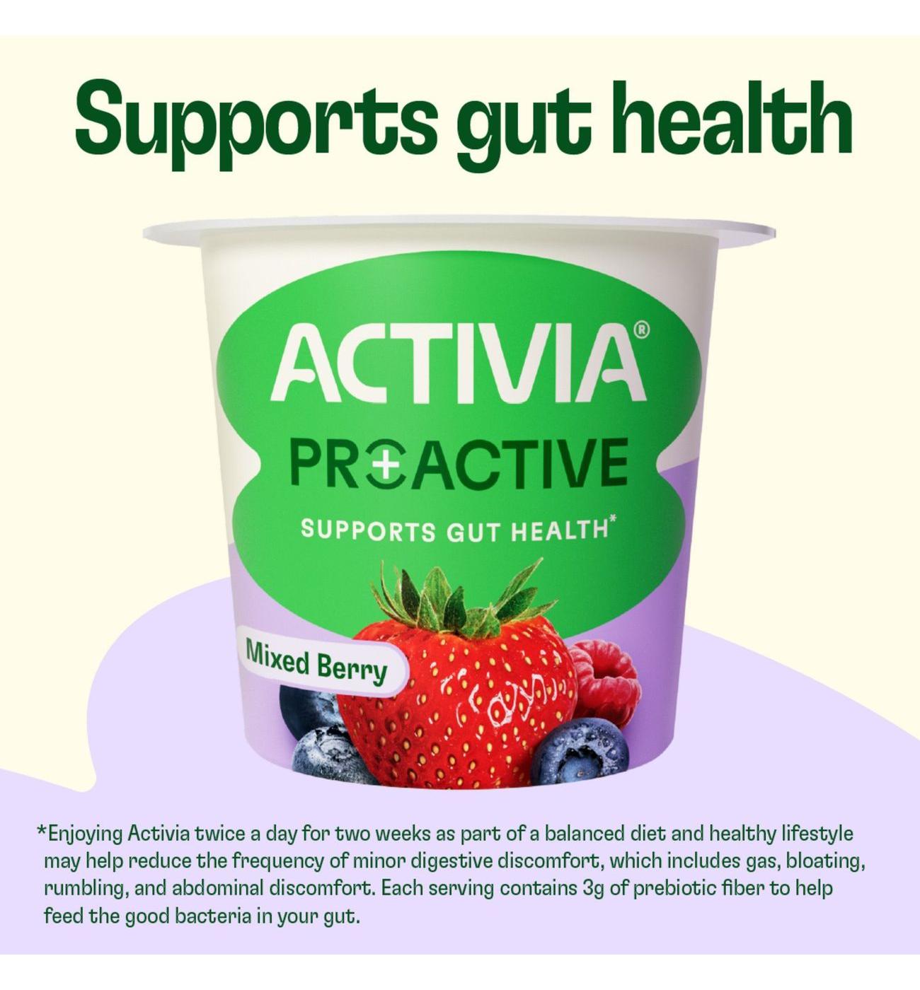 • Prebiotics and Probiotics: Activia Proactive Mixed Berry yogurt has prebiotics to feed good gut bacteria and billions of probiotics in each cup​