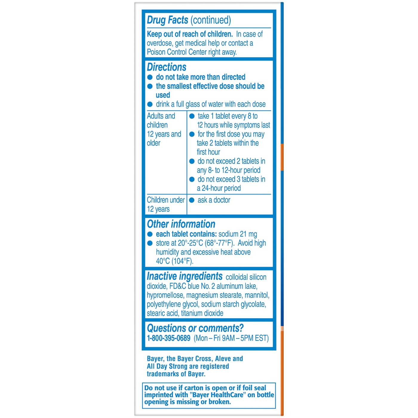 Allergy Alert: Naproxen sodium may cause a severe allergic reaction, especially in people allergic to aspirin. Symptoms may include: hives, facial swelling, asthma (wheezing), shock, skin reddening, rash, blisters. If an allergic reaction occurs, stop use and seek medical help right way.. Stomach Bleeding Warning: This product contains an NSAID, which may cause severe stomach bleeding. The chance is higher if you: are age 60 or older, have had stomach ulcers or bleeding problems, take a blood thinning (anticoagulant) or steroid drug, take other drugs containing prescription or nonprescription NSAIDs (aspirin, ibuprofen, naproxen, or others), have 3 or more alcoholic drinks every while using this product, take more or for a longer time than directed.. Heart Attack and Stroke Warning: NSAIDs, except aspirin, increase the risk of heart attack, heart failure, and stoke. These can be fatal. The risk is higher if you use more than directed or for longer than directed. Do not use if you have ever had an allergic reaction to any other pain reliever/fever reducer, right before or after heart surgery.. Ask a doctor before use if the stomach bleeding warning applies to you, you have a history of stomach problems, such as heartburn, you have high blood pressure, heart disease, liver cirrhosis, kidney disease, asthma, or had a stroke, you are taking a diuretic, you have problems or serious side effects from taking pain relievers or fever reducers.. Ask a doctor or pharmacist before use if you are under a doctor's care for any serious condition, taking aspirin for heart attack or stroke, because naproxen may decrease this benefit of aspirin, taking any other drug.. When using this product take with food or milk if stomach upset occurs.. Stop use and ask a doctor if you experience any of the following signs of stomach bleeding: feel faint; vomit blood; have a bloody or black stools; have stomach pain that does not get better, you have symptoms of heart problems or stroke: chest pain; trouble breathing; weakness in one part or side of body; slurred speech; leg swelling, pain gets worse or lasts more than 10 days, fever gets worse or lasts more than 3 days, you have difficulty swallowing, it feels like the pill is stuck in your throat, redness or swelling is present in the painful area, any new symptoms appear.. If pregnant or breast-feeding, ask a health professional before use. It is especially important not to use naproxen sodium during the last 3 months of pregnancy unless definitely directed to do so by a doctor because it may cause problems in the unborn child or complications during delivery. Keep out of reach of children. In case of overdose, get medical help or contact a Poison Control Center right away. Do not use if carton is open or if foil seal imprinted with Bayer HealthCare on bottle opening is missing or broken.