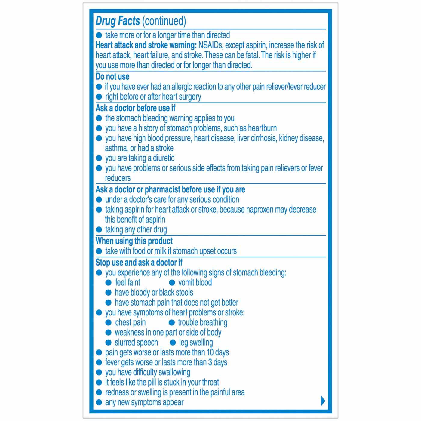 Allergy Alert: Naproxen sodium may cause a severe allergic reaction, especially in people allergic to aspirin. Symptoms may include: hives, facial swelling, asthma (wheezing), shock, skin reddening, rash, blisters. If an allergic reaction occurs, stop use and seek medical help right away.. Stomach Bleeding Warning: This product contains an NSAID, which may cause severe stomach bleeding. The chance is higher if you: are age 60 or older, have had stomach ulcers or bleeding problems, take a blood thinning (anticoagulant) or steroid drug, take other drugs containing prescription or nonprescription NSAIDs (aspirin, ibuprofen, naproxen, or others), have 3 or more alcoholic drinks every day while using this product, take more or for a longer time than directed.. Heart Attack and Stroke Warning: NSAIDs, except aspirin, increase the risk of heart attack, heart failure, and stroke. These can be fatal. The risk is higher if you use more than directed or for longer than directed. Do not use if you have ever had an allergic reaction to any other pain reliever/fever reducer, right before or after heart surgery.. Ask a doctor before use if the stomach bleeding warning applies to you, you have a history of stomach problems, such as heartburn, you have high blood pressure, heart disease, liver cirrhosis, kidney disease, asthma, or had a stroke, you are taking a diuretic, you have problems or serious side effects from taking pain relievers or fever reducers.. Ask a doctor or pharmacist before use if you are under a doctor's care for any serious condition, taking aspirin for heart attack or stroke, because naproxen may decrease this benefit of aspirin, taking any other drug.. When using this product take with food or milk if stomach upset occurs.. Stop use and ask a doctor if you experience any of the following signs of stomach bleeding: feel faint; vomit blood; have bloody or black stools; have stomach pain that does not get better, you have symptoms of heart problems or stroke: chest pain; trouble breathing; weakness in one part or side of body; slurred speech; leg swelling, pain gets worse or lasts more than 10 days, fever gets worse or lasts more than 3 days, you have difficulty swallowing, it feels like the pill is stuck in your throat, redness or swelling is present in the painful area, any new symptoms appear.. If pregnant or breast-feeding, ask a health professional before use. It is especially important not to use naproxen sodium during the last 3 months of pregnancy unless definitely directed to do so by a doctor because it may cause problems in the unborn child or complications during delivery. Keep out of reach of children. In case of overdose, get medical help or contact a poison control center right away. Do not use if carton is open or if foil seal imprinted with Bayer HealthCare on bottle opening is missing or broken.