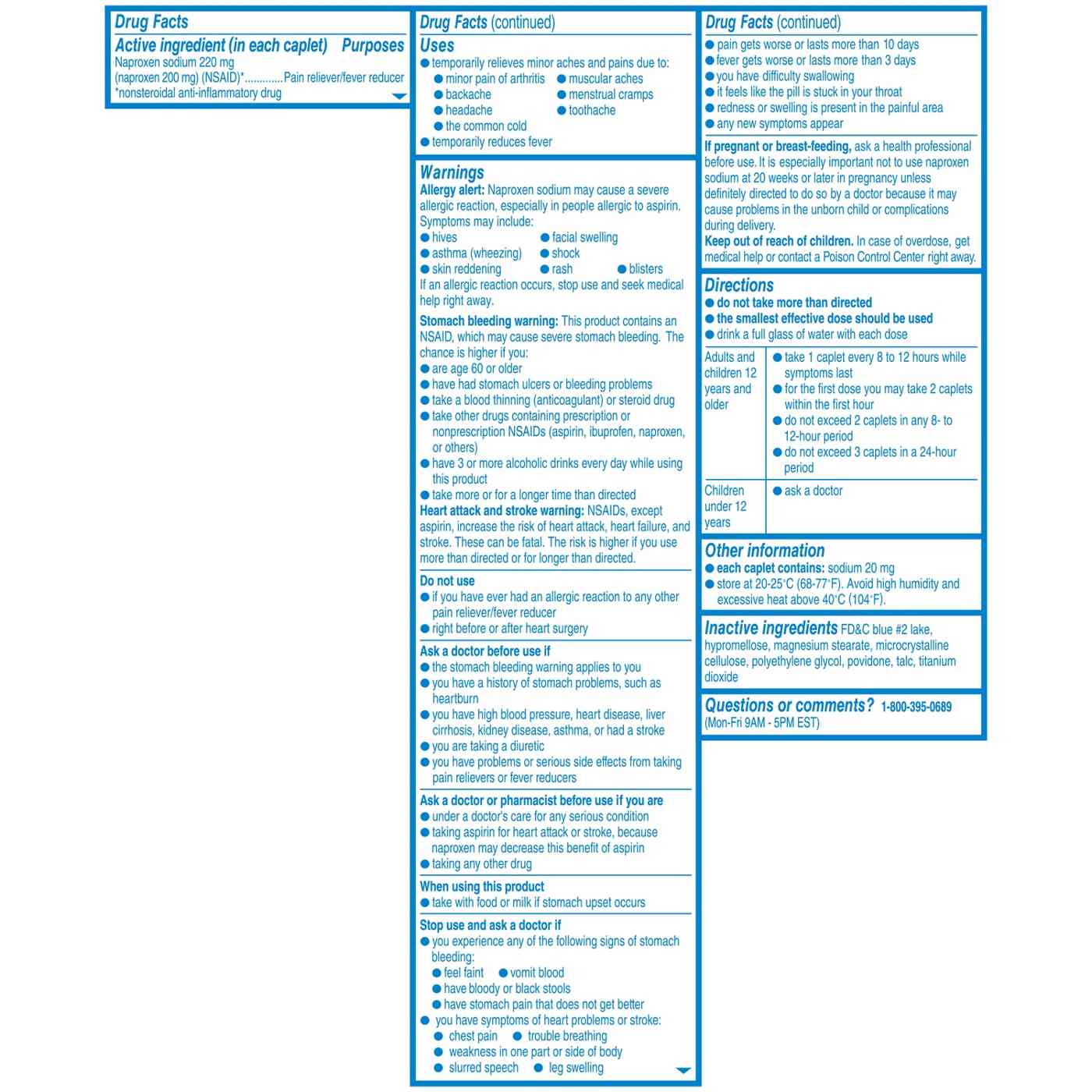 Active Ingredients: Naproxen Sodium 220mg (Naproxen 200 mg) (NSAID) (Nonsteroidal anti-inflammatory drug) (220 mg), Pain reliever/Fever reducer. Inactive Ingredients: FD&C Blue 2 Lake, Hypromellose, Magnesium Stearate, Microcrystalline Cellulose, Polyethylene Glycol, Povidone, Talc, Titanium Dioxide.Allergens and safety warnings