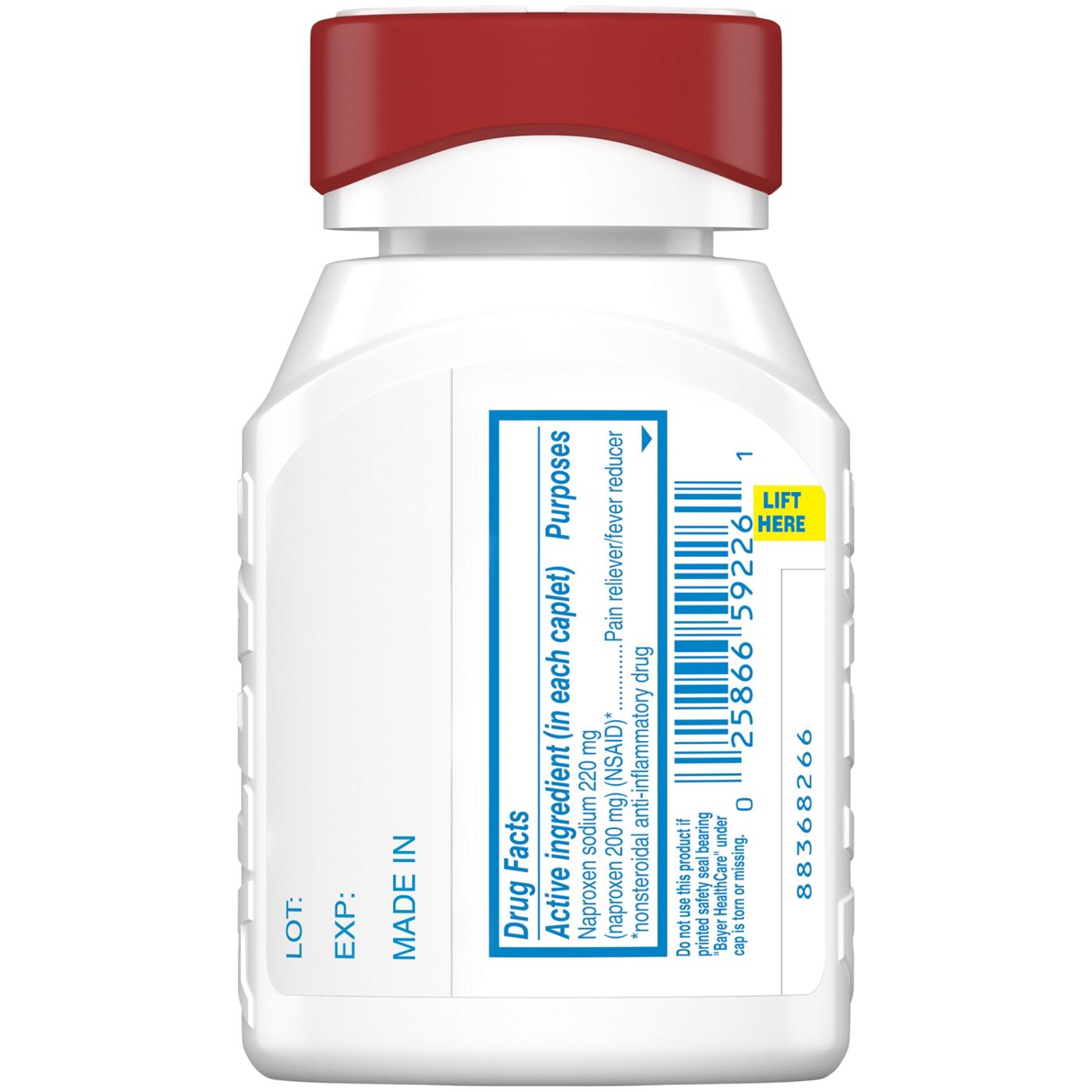 Warnings: Stomach bleeding warning: This product or NSAID, which may cause severe stomach bleeding chance is higher if you:: are age 60 or older; have had stomach ulcers or bleeding problems; take a blood thinning (anticoagulant) or steroid drug; take other drugs containing prescription or nonprescription NSAIDs (aspirin, ibuprofen, naproxen, or others); have 3 or more alcoholic drinks every day while using this product; take more or for a longer time than directed Heart attack and stroke warning: NSAIDs, except aspirin, increase the risk of heart attack, heart failure, and stroke. These can be fatal. The risk is higher if you use more than directed or for longer than directed Do not use: if you have ever had an allergic reaction to any other pain reliever/fever reducer; right before or after heart surgery Ask a doctor before use if: the stomach bleeding warning applies to you; you have a history of stomach problems, such as heartburn; you have high blood pressure, heart disease, liver cirrhosis, kidney disease, asthma, or had a stroke; you are taking a diuretic; you have problems or serious side effected from taking pain relievers or fever reducers Ask a doctor or pharmacist before use if you are: under a doctor's care for any serious condition; taking aspirin for heart attack or stroke, because naproxen may decrease this benefit of aspirin; taking any other drug When using this product: take with food or milk if stomach upset occurs Stop use and ask a doctor if: you experience any of the following signs of stomach bleeding:; feel faint; vomit blood; have bloody or black stools; have stomach pain that does not get better; you have symptoms of heart problems of stroke; chest pain; trouble breathing; weakness in one part or side of body; slurred speech; leg swelling; pain gets worse or lasts more than 10 days; fever gets worse or lasts more than 3 days; you have difficulty swallowing; it feels like the pill is stuck in your throat; redness or swelling is present in the painful area; any new symptoms appear If pregnant or breast-feeding, ask a health professional before use. It is especially important not to use naproxen sodium at 20 weeks or later in pregnancy unless definitely directed to do so by a doctor because if may cause problems in the unborn child or complications during delivery Keep out of reach of children. In case of overdose, get medical help or contact a poison control center right away Do not use this product if printed safety seal bearing Bayer HealthCare under cap is torn or missing.
