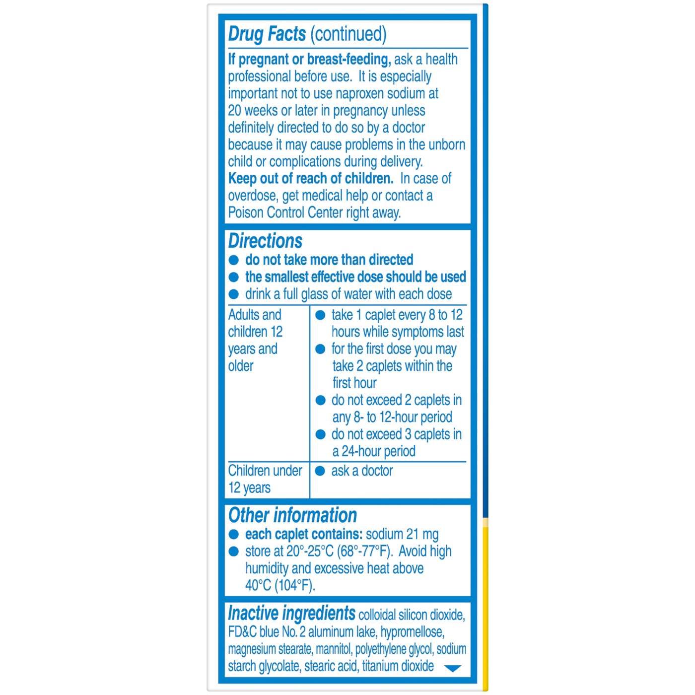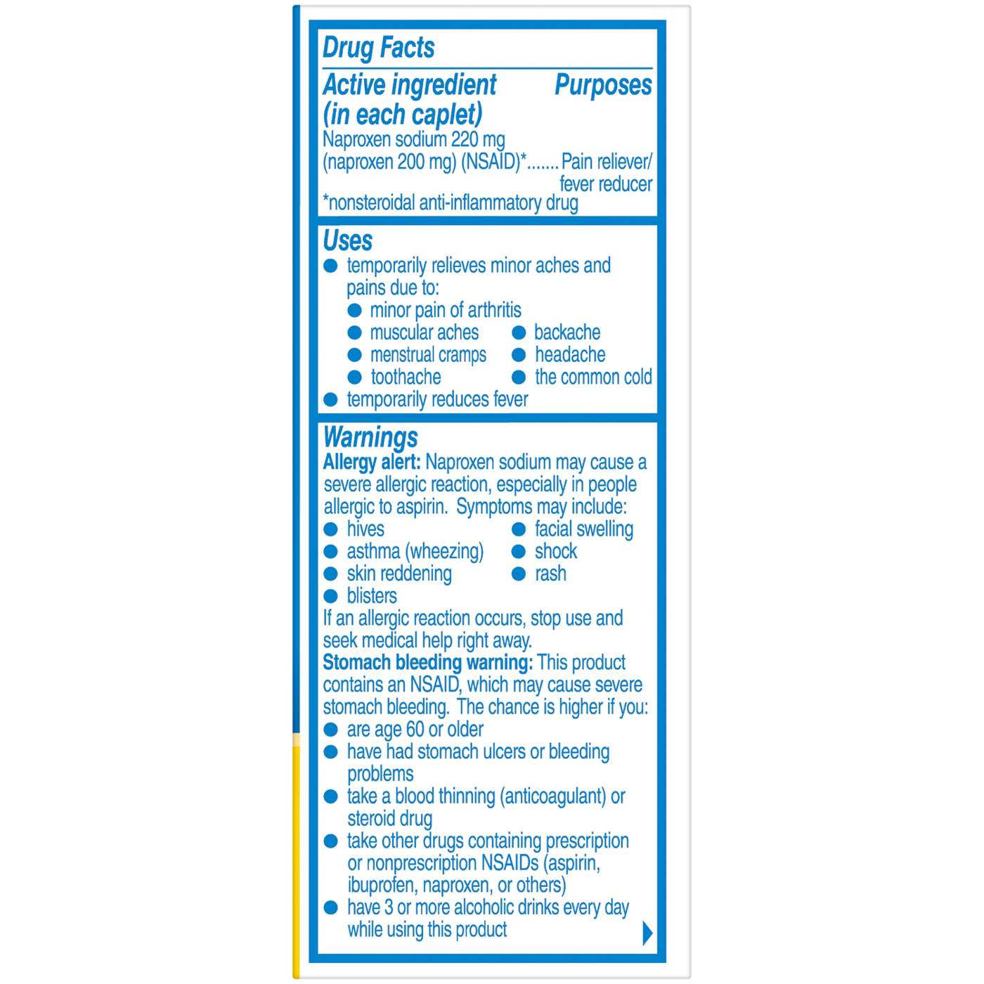 In Each Caplet: Warnings: Allergy alert: Naproxen sodium may cause a severe allergic reaction, especially in people allergic to aspirin. Symptoms may include: hives; facial swelling; asthma (wheezing); shock; skin reddening; rash; blisters. If an allergic reaction occurs, stop use and seek medical help right away. Stomach bleeding warming: This product contains an NSAID, which may cause severe stomach bleeding. The chance is higher if you: are age 60 or older; have had stomach ulcers or bleeding problems; take a blood thinning (anticoagulant) or steroid drug; take other drugs containing prescription or nonprescription NSAIDS (aspirin, ibuprofen, naproxen, or others); have 3 or more alcoholic drinks every day while using this product; take more or for a longer time than directed. Heart attack and stroke warning: NSAIDS, except aspirin, increase the risk of heart attack, heart failure, and stroke. These can be fatal. The risk is higher if you use more than directed or for longer than directed. Do not use: if you have ever had an allergic reaction to any other pain reliever/fever reducer; right before or after heart surgery. Ask a doctor before use if: the stomach bleeding warning applies to you; you have a history of stomach problems, such as heartburn; you have high blood pressure, heart disease, liver cirrhosis, kidney disease, asthma, or had a stroke; you are taking a diuretic; you have problems or serious side effects from taking pain relievers or fever reducers. Ask a doctor or pharmacist before use if you are: under a doctor's care for any serious condition; taking aspirin for heart attack or stroke, because naproxen may decrease this benefit of aspirin; taking any other drug. When using this product: take with food or milk if stomach upset occurs. Stop use and ask a doctor if: you experience any of the following signs of stomach bleeding: feel faint; vomit blood; have bloody or black stools; have stomach pain that does not get better; you have symptoms of heart problems or stroke: chest pain; trouble breathing; weakness in one part or side of body; slurred speech; leg swelling; pain gets worse or lasts more than 10 days; fever gets worse or lasts more than 3 days; you have difficulty swallowing; it feels like the pill is stuck in your throat; redness or swelling is present in the painful area; any new symptoms appear. If pregnant or breast-feeding, ask a health professional before use. It is especially important not to use naproxen sodium at 20 weeks or later in pregnancy unless definitely directed to do so by a doctor because it may cause problems in the unborn child or complications during delivery. Keep out of reach of children. In case of overdose, get medical help or contact a Poison Control Center right away. Do not use if carton is open or if foil seal imprinted with Bayer Healthcare on bottle opening is missing or broken.