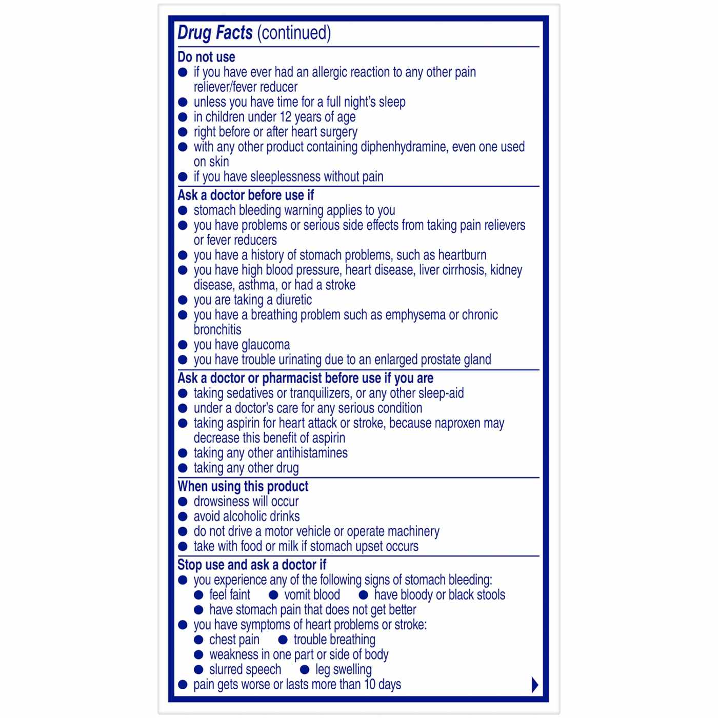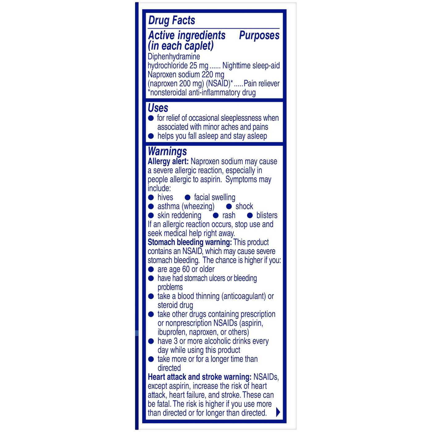 Allergy alert: Naproxen sodium may cause a severe allergic reaction, especially in people allergic to aspirin. Symptoms may include: hives, facial swelling, asthma (wheezing), shock, skin reddening, rash, blisters. If an allergic reaction occurs, stop use and seek medical help right away.. Stomach bleeding warning: This product contains an NSAID, which may cause severe stomach bleeding. The chance is higher if you are age 60 or older, have had stomach ulcers or bleeding problems, take a blood thinning (anticoagulant) or steroid drug, take other drugs containing prescription or nonprescription NSAIDs (aspirin, ibuprofen, naproxen, or others), have 3 or more alcoholic drinks every day while using this product, take more or for a longer time than directed.. Heart attack and stroke warning: NSAIDs, except aspirin, increase the risk of heart attack, heart failure, and stroke. These can be fatal. The risk is higher if you use more than directed or for longer than directed. Do not use if you have had an allergic reaction to any other pain reliever/fever reducer, unless you have time for a full night's sleep, in children under 12 years of age, right before or after heart surgery, with any other product containing diphenhydramine, even one used on skin, if you have sleeplessness without pain.. Ask a doctor before use if stomach bleeding warning applies to you, you have problems or serious side effects from taking pain relievers or fevers reducers, you have a history of stomach problems, such as heartburn, you have high blood pressure, heart disease, liver cirrhosis, kidney disease, asthma, or had a stroke, you are taking a diuretic, you have a breathing problem such a emphysema or chronic bronchitis, you have glaucoma, you have trouble urinating due to an enlarged prostate gland.. Ask a doctor or pharmacist before use if you are taking sedatives or tranquilizers, or any other sleep-aid, under a doctor's care for any serious condition, taking aspirin for heart attack or stroke, because naproxen may decrease this benefit of aspirin, taking any other antihistamines, taking any other drug.. When using this product drowsiness will occur, avoid alcoholic drinks, do not drive a motor vehicle or operate machinery, take with food or milk if stomach upset occurs.. Stop use and ask a doctor if you experience any of the following signs of stomach bleeding: feel faint; vomit blood; have bloody or black stools; have stomach pain that does not get better, you have symptoms of heart problems or stroke: chest pain; trouble breathing; weakness in one part of side of body; slurred speech; leg swelling, pain gets worse or lasts more than 10 days, sleeplessness persists continuously for more than 2 weeks. Insomnia may be a symptom of a serious underlying medical illness, redness or swelling is present in the painful area, any new symptoms appear, you have difficulty swallowing, it feels like the pill is stuck in your throat.. If pregnant or breast-feeding, ask a health professional before use. It is especially important not to use naproxen sodium during the last 3 months of pregnancy unless definitely directed to do so by a doctor because it may cause problems in the unborn child or complications during delivery. Keep out of reach of children. In case of overdose, get medical help or contact a Poison Control Center right away. Do not use if carton is open or if foil seal imprinted with Bayer HealthCare on bottle opening is missing or broken.