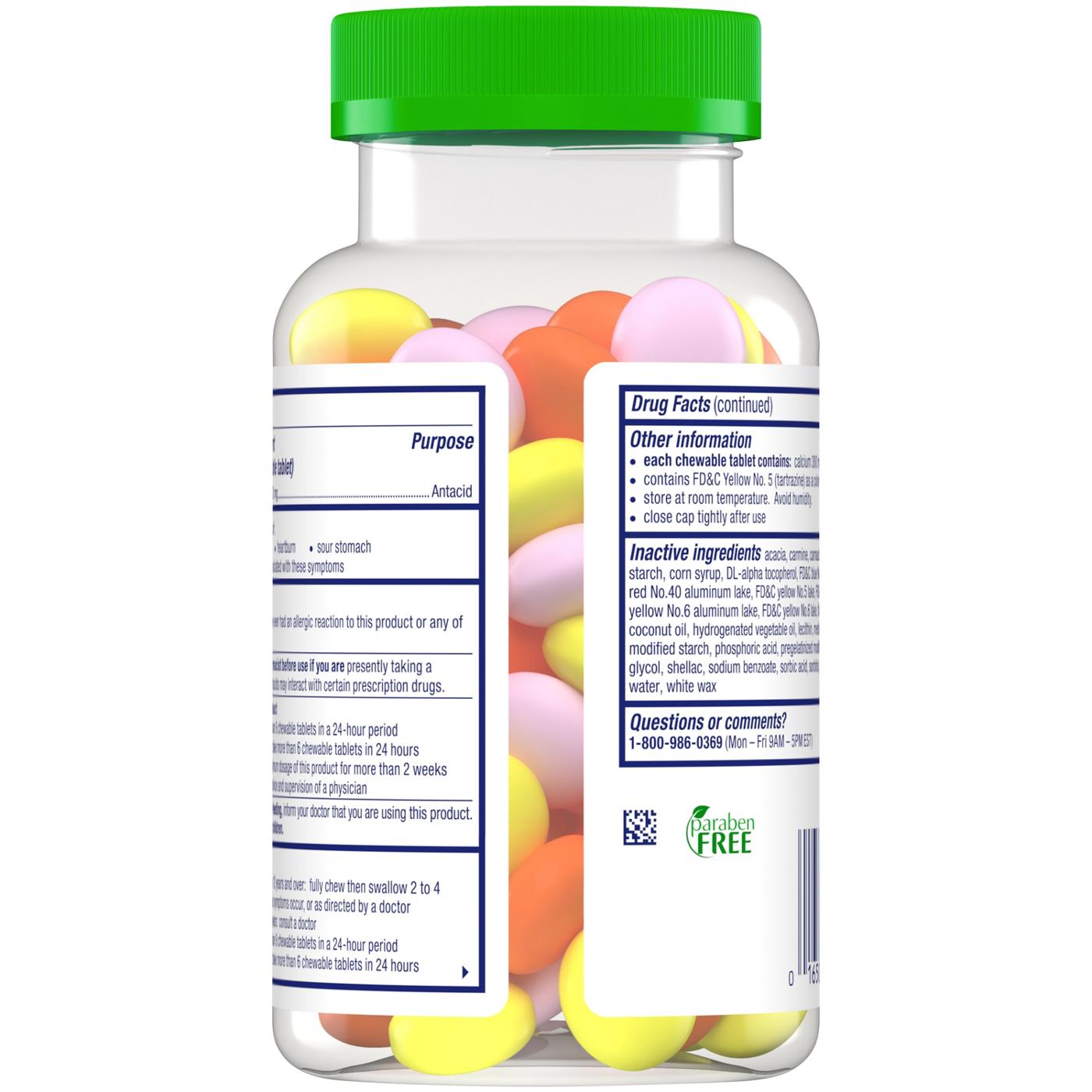 Active Ingredients: In Each Chewable Tablet: Calcium Carbonate (750 mg). Purpose: Antacid. Inactive Ingredients: Acacia, Carmine, Carnauba Wax, Citric Acid, Corn Starch, Corn Syrup, Dl -Alpha Tocopherol, FD&C Blue 1 Aluminum Lake, FD&C Red 40 Aluminum Lake, FD&C Yellow 5 Lake, FD&C Yellow 6 Lake, Flavors, Hydrogenated Coconut Oil, Hydrogenated Vegetable Oil, Lecithin, Medium Chain Triglycerides, Modified Starch, Phosphoric Acid, Pregelatinized Modified Starch, Propylene Glycol, Shellac, Sodium Benzoate, Sorbic Acid, Sorbitol, Sugar, Titanium Dioxide, Water, White WaxAllergens and safety warnings