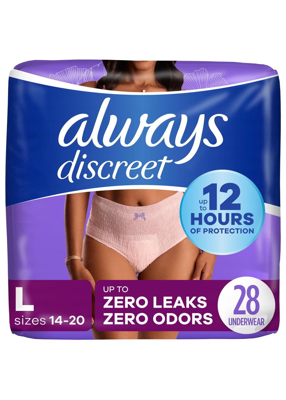 Finally, long-lasting bladder leak protection that feels as good as it looks. Say 'never again' to bulky adult diapers and 'hello' to Always Discreet disposable incontinence underwear for women with a smooth and secure fit that looks and feels like real underwear. The form-fitting design of Always Discreet Incontinence and Postpartum Underwear for women hugs your curves with a soft, silk-like fabric so you can walk with poise and confidence. It's the delicate, barely noticeable look you want in disposable panties for women, paired with the leak-proof protection you deserve. The super absorbent core turns liquid to gel to stop bladder leaks in seconds for up to 12 hours of reliable leak-free protection. Exclusive OdorLock Technology neutralizes odors instantly and continuously, to help you feel confidently fresh and dry all day long. Unexpected leaks don't stand a chance with the special side LeakGuard design that helps stop bladder leaks at the leg, where they happen most. Get incredible protection with the disposable underwear women can depend on. Specially designed to fit all kinds of curves, Always Discreet Incontinence Underwear is available in sizes Small / Medium - Large / Extra Large/ XXL, so you'll be sure to get the protection you deserve with Always Discreet incontinence and postpartum underwear. Easy Open Bags for extra convenience. Incontinence panties for women ship discreetly and are available in bulk.